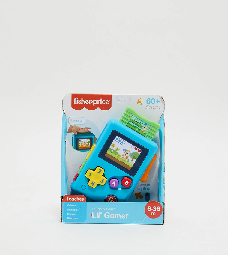 لعبة فيشر برايس لاف آند ليرن ليل جيمر هي لعبة موسيقية تفاعلية ممتعة مصممة للأطفال من عمر 6 أشهر فما فوق، وتأتي على شكل جهاز ألعاب محمول يشبه الحقيقي، مع شاشة مضيئة، أزرار A وB، لوحة تحكم (D-pad)، وشريط ألعاب وهمي.