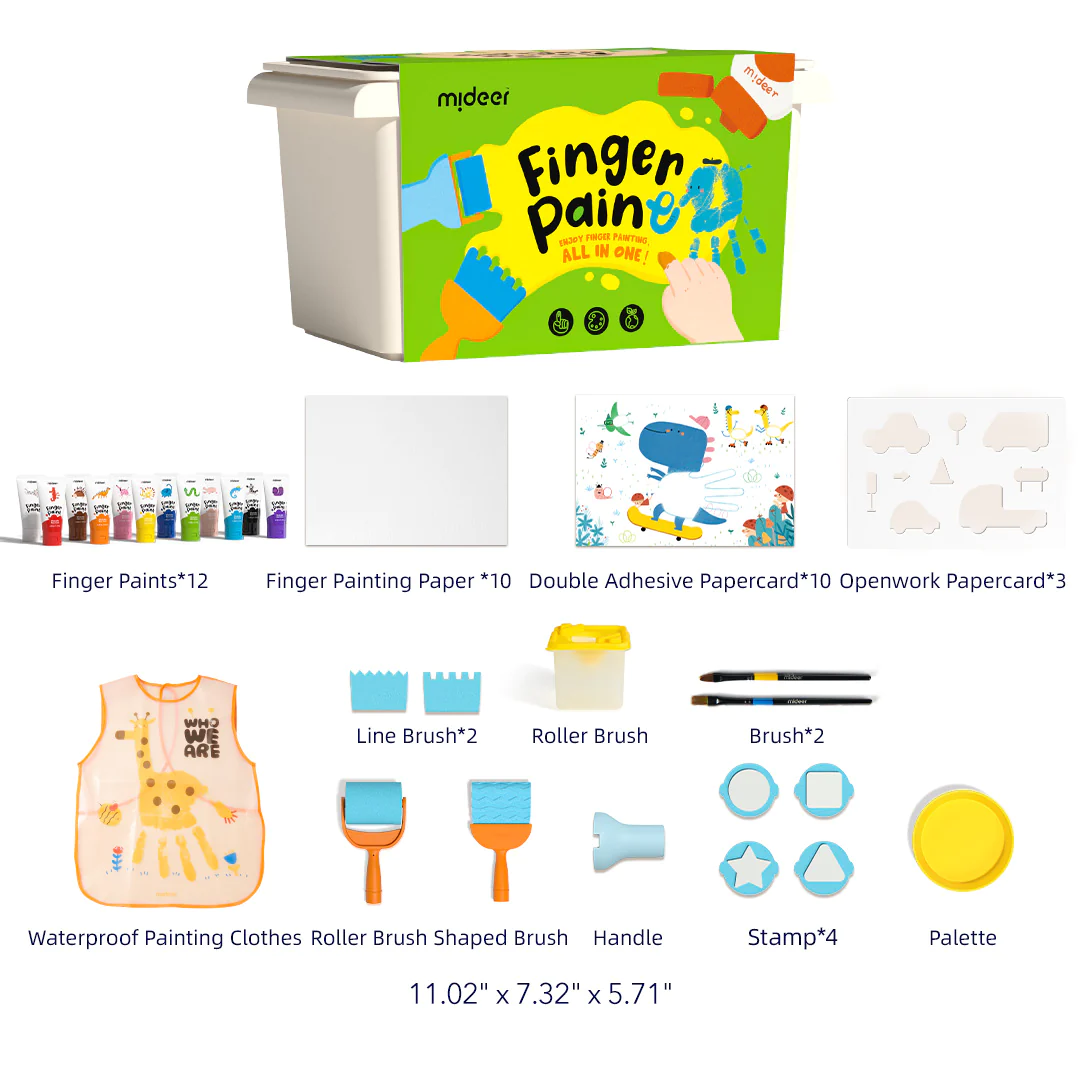 - 👜 المحتويات: 3 بطاقات ورقية مفتوحة، 10 بطاقات لاصقة مزدوجة، 12 لون أصابع، 2 فرشاة، 10 أوراق رسم بأصابع، أنبوب فرشاة، لوحة، قطعة قماش مقاومة للماء، فرشاة دوارة، فرشاة شكل، 2 فرشاة خط، 1 مقبض، 4 طوابع