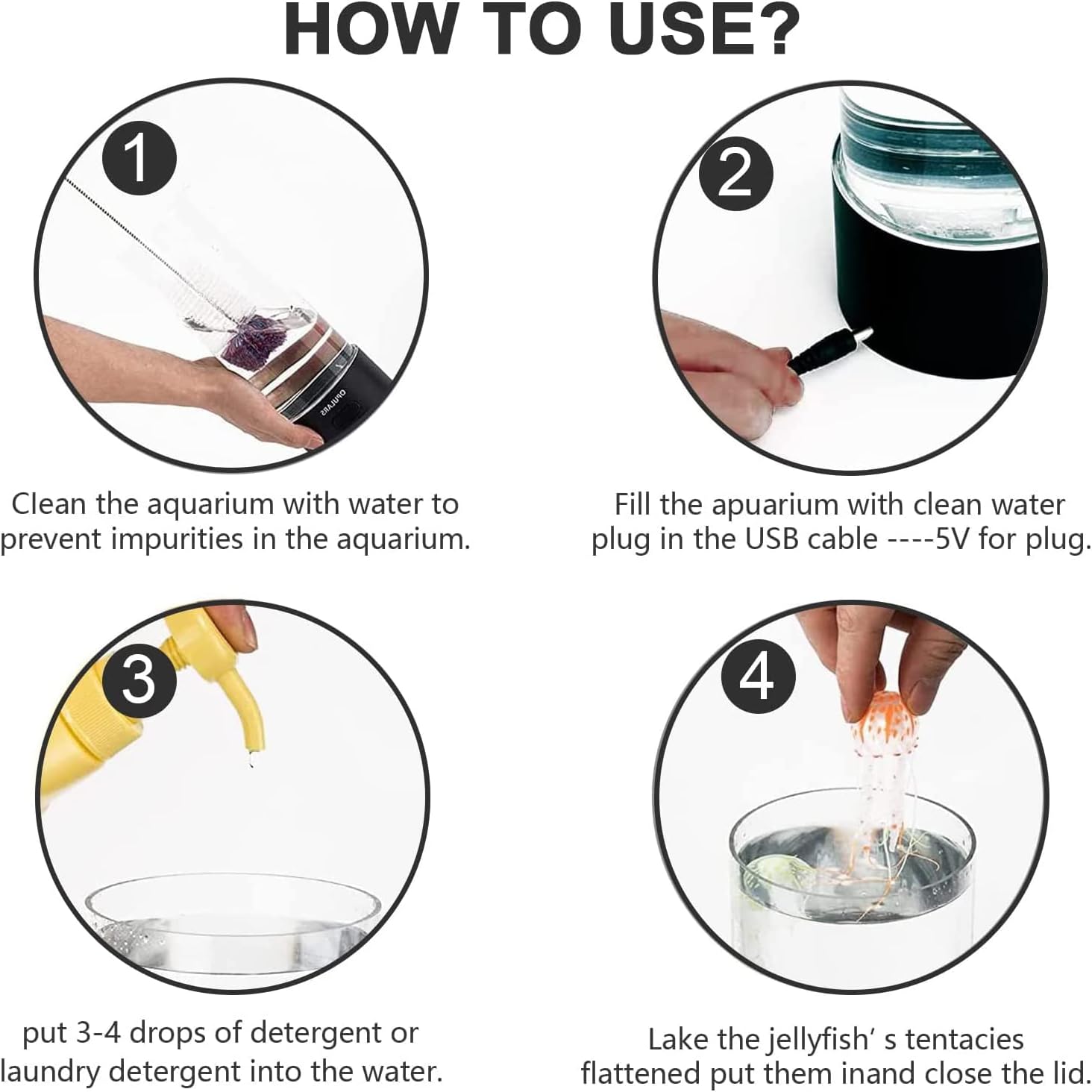 أضف لمسة فريدة لأي غرفة مع حوض Jellyfish الدائري. يخلق جوًا رائعًا بتوهج أضواء LED، مثالي للأرفف أو الأدراج أو الرفوف، وسيكون حديث الجميع في التجمعات. الحوض البلاستيكي قابل للملء من خلال فتحة صغيرة في الأعلى مع سدادة محكمة. يحتوي على سمكتين من السيليكون (5 سم طول الجسم) تسبحان بحركة واقعية بفضل تيارات الهواء.