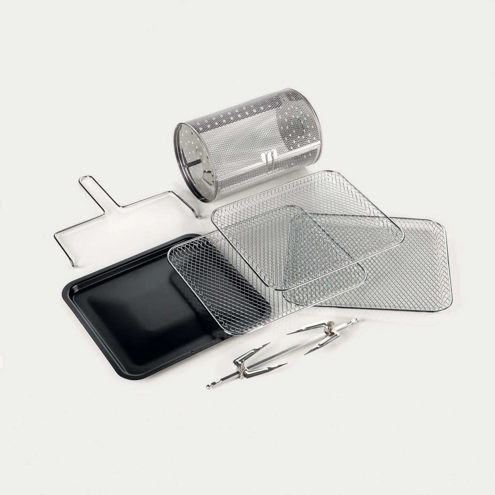 - Accessories: 3 grills, roasting pan, rotisserie, rotating basket, handle for skewer removal and basket.