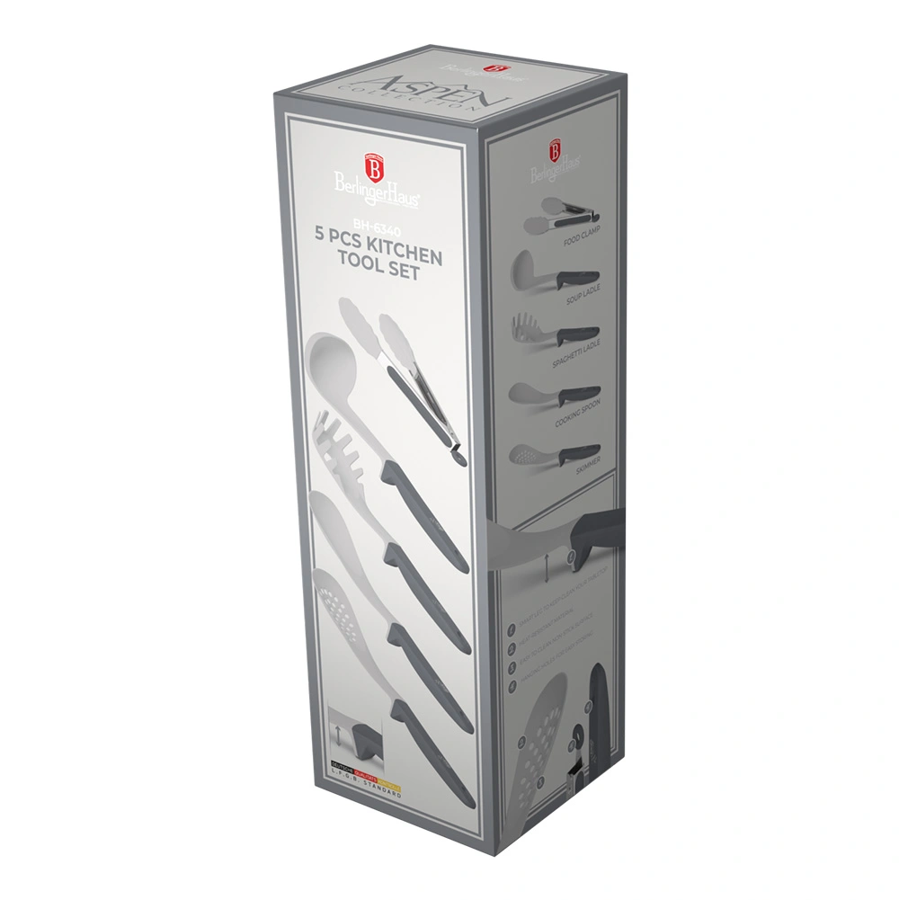 Set Includes: 1 Cooking spoon, 1 Spaghetti ladle, 1 Skimmer, 1 Soup ladle, 1 Food clamp.