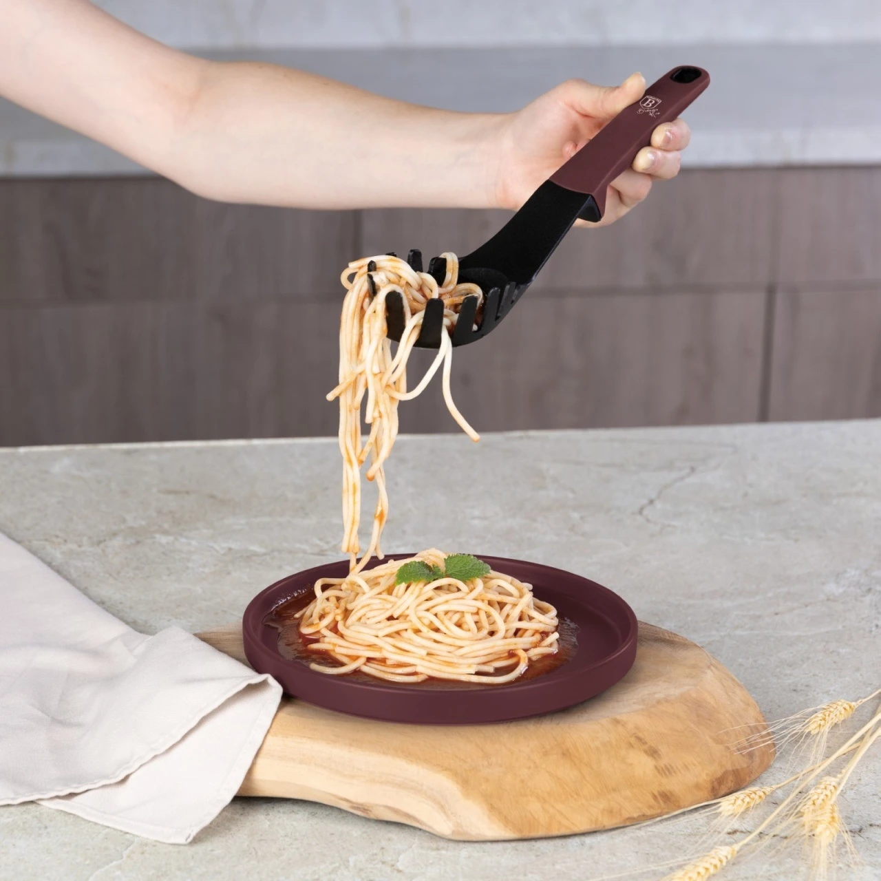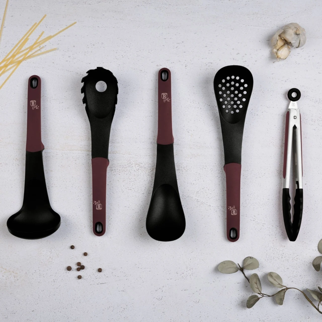 Set Includes: 1 Cooking spoon, 1 Spaghetti ladle, 1 Skimmer, 1 Soup ladle, 1 Food clamp.
