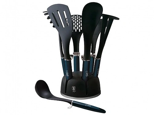 Set Includes: Soup ladle, Cooking spoon, Masher, Spaghetti ladle, Slotted turner, Skimmer, Stand.