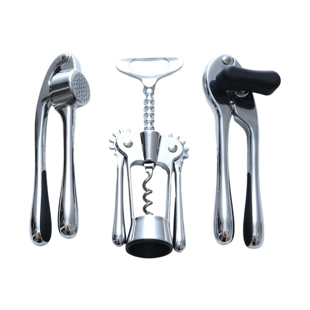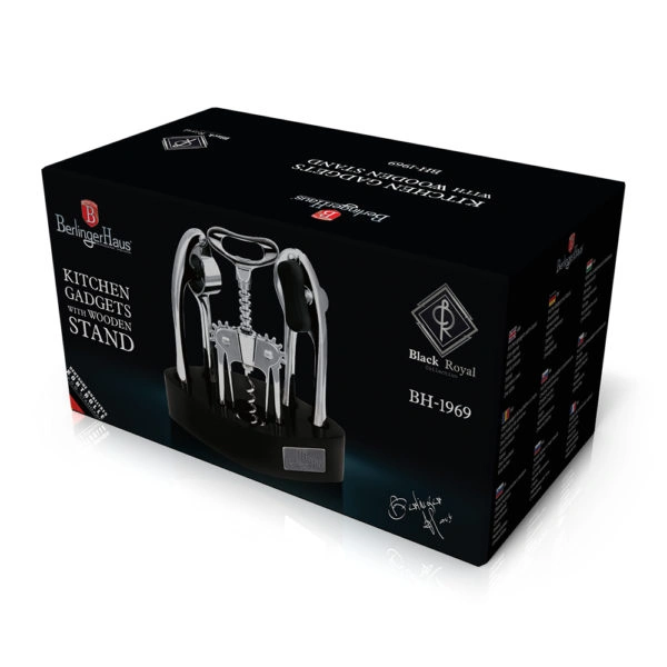 Set Includes: Wine opener, Can opener, Garlic presser, Peeler, Wooden stand