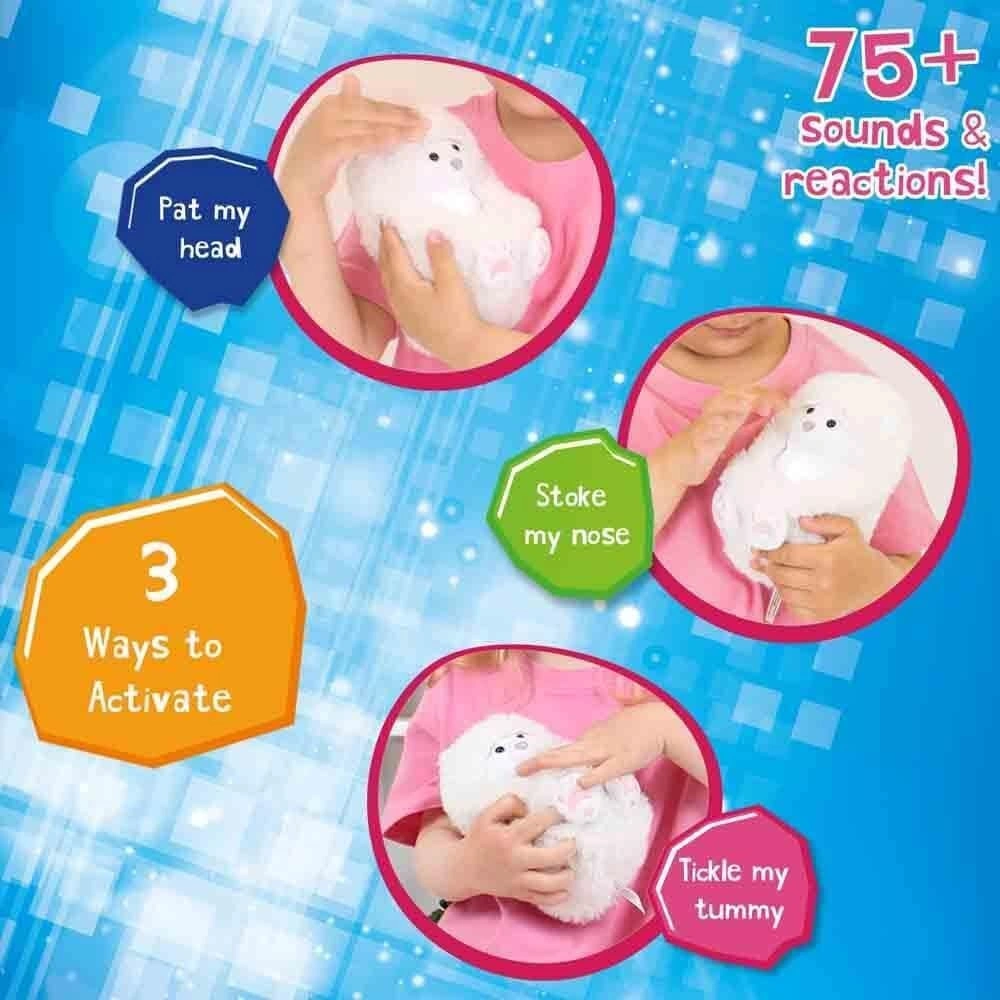 3 ways to interact with over 50 sounds and reactions: pat the head, tap the nose, tickle the belly.
