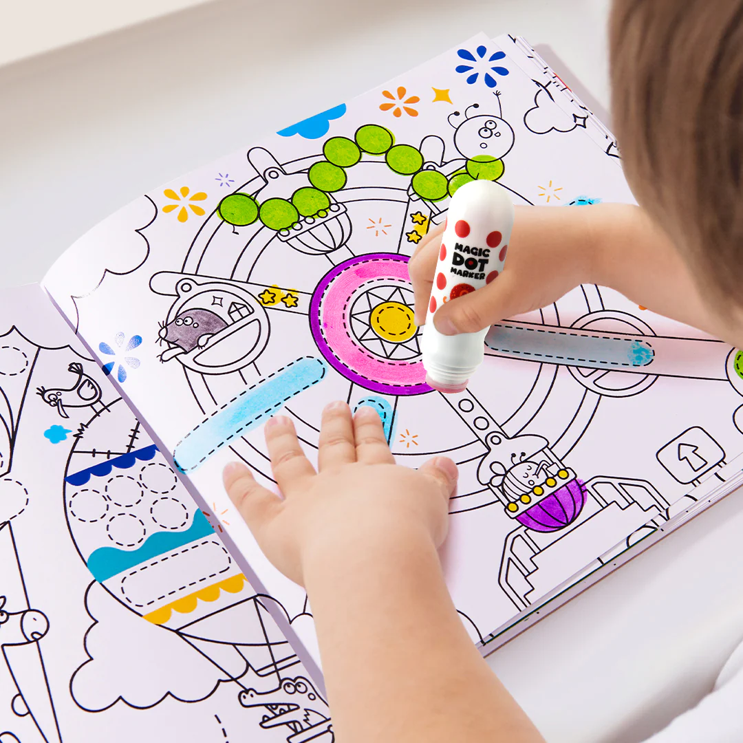 Magic Dot Dot coloring books are designed specifically for Magic Dot Marker. 200g double-adhesive paper is thick and impervious to ink, which provides better drawing experience. Larger than A4 paper size, allowing children to scribble freely. This Wonderland themed one increases the difficulty a little compared to Dreamland.