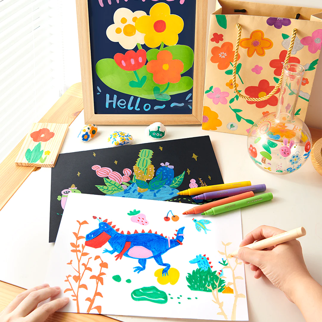 These water-based paint markers work well on high-coloration surfaces. Enjoy the smooth ink flow. Easily wipe off with a wet cloth when painting on smooth surfaces like glass.