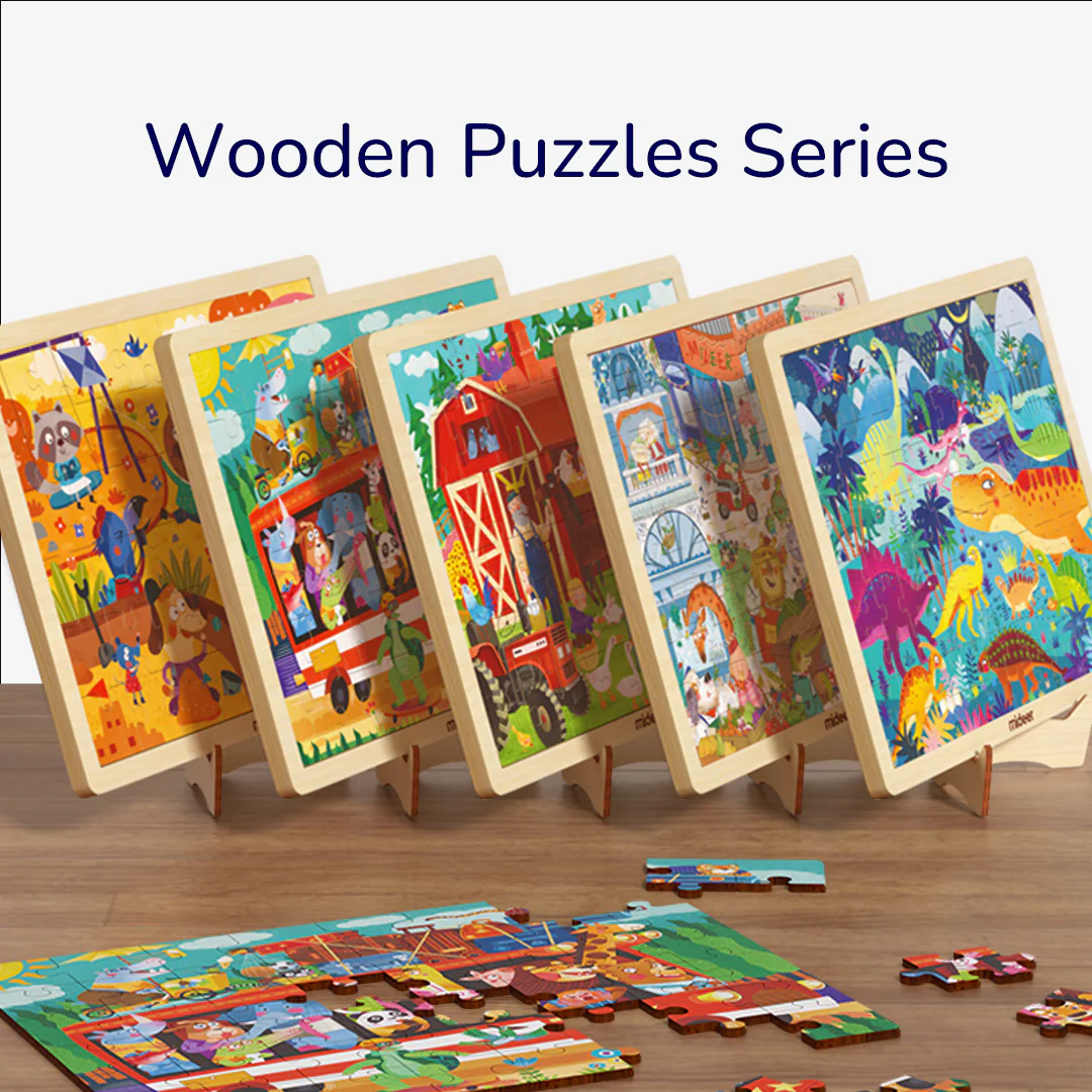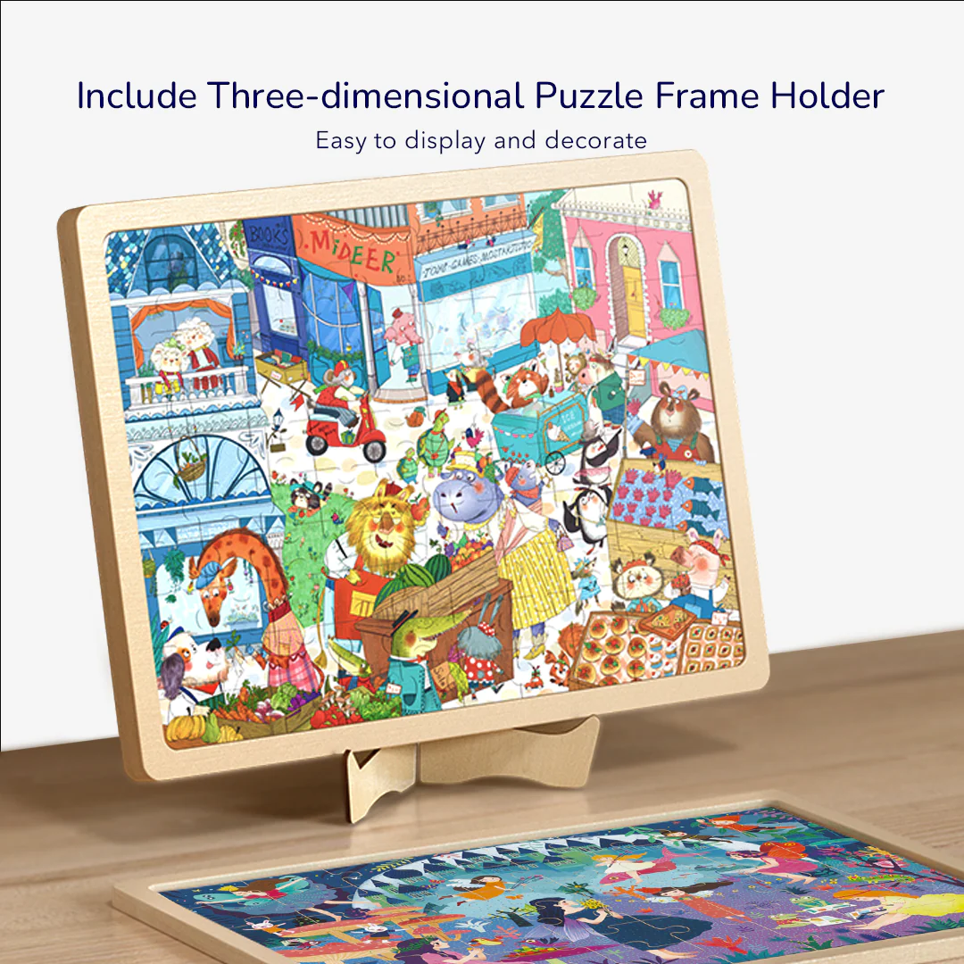 Bring play and learning together with the "Small Town Market" Wooden Puzzle by Mideer.