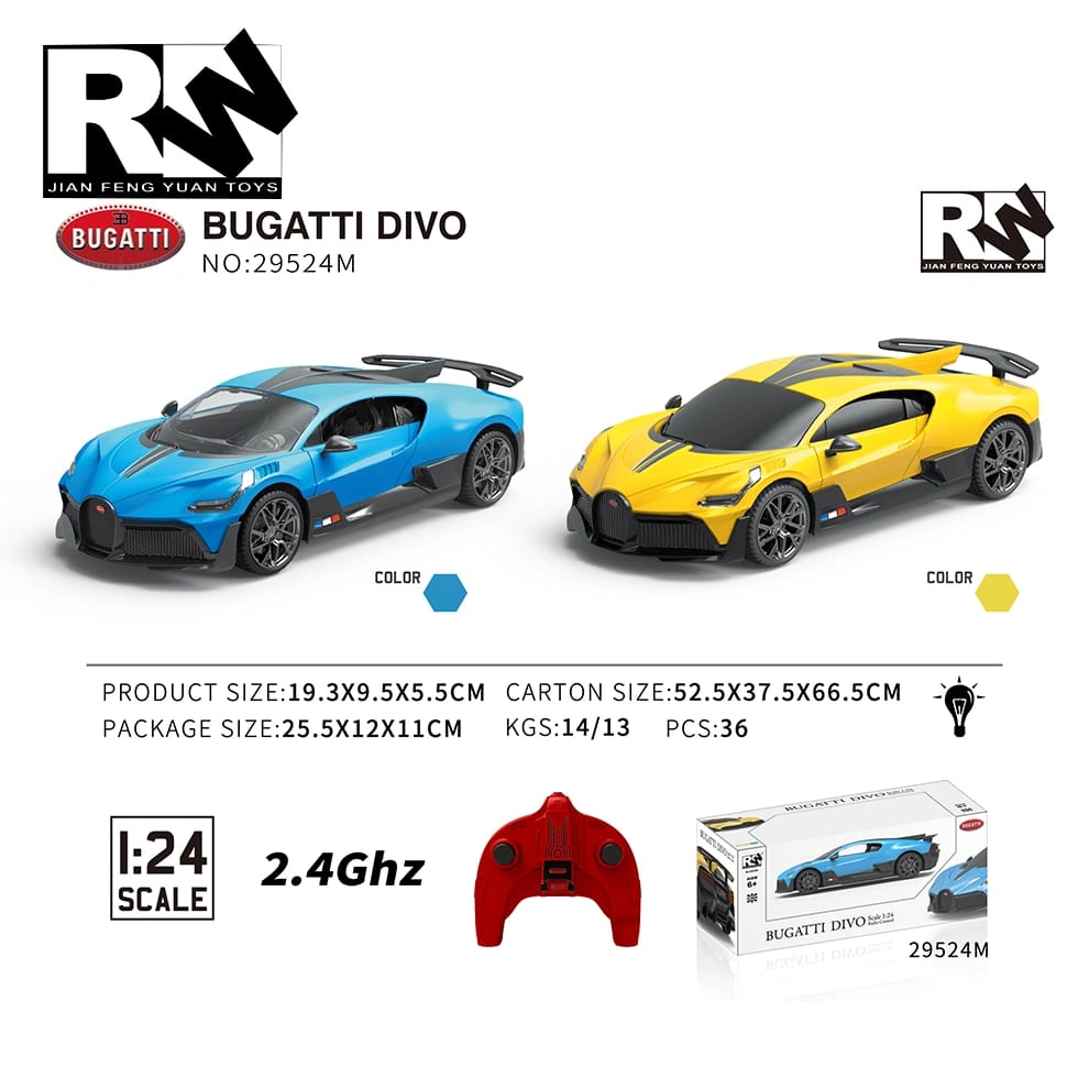 Feel the thrill with the 1:24 Bugatti Divo RC Car in bright yellow. Runs on 3 x 1.5V AA batteries (not included), and 2 x AA for the controller (not included). Dimensions: 19.3 x 9.5 x 5.5 cm. Eye-catching design with smooth control and compact size.