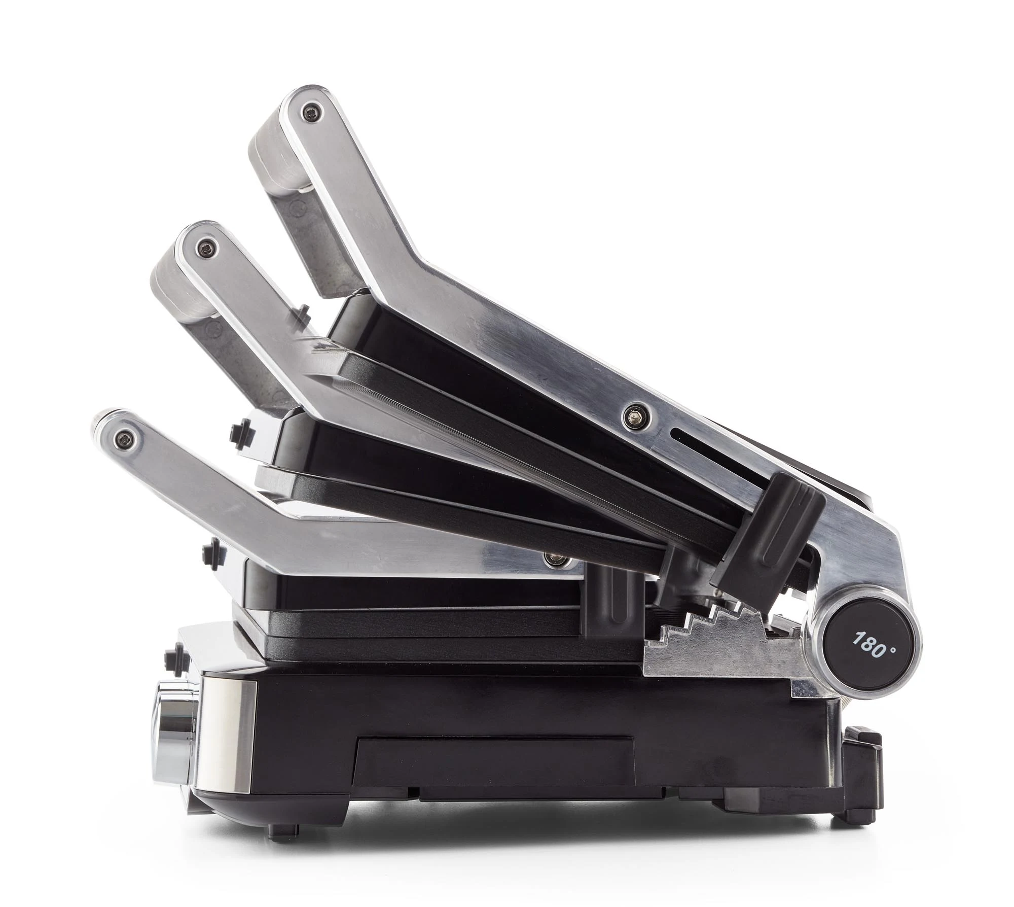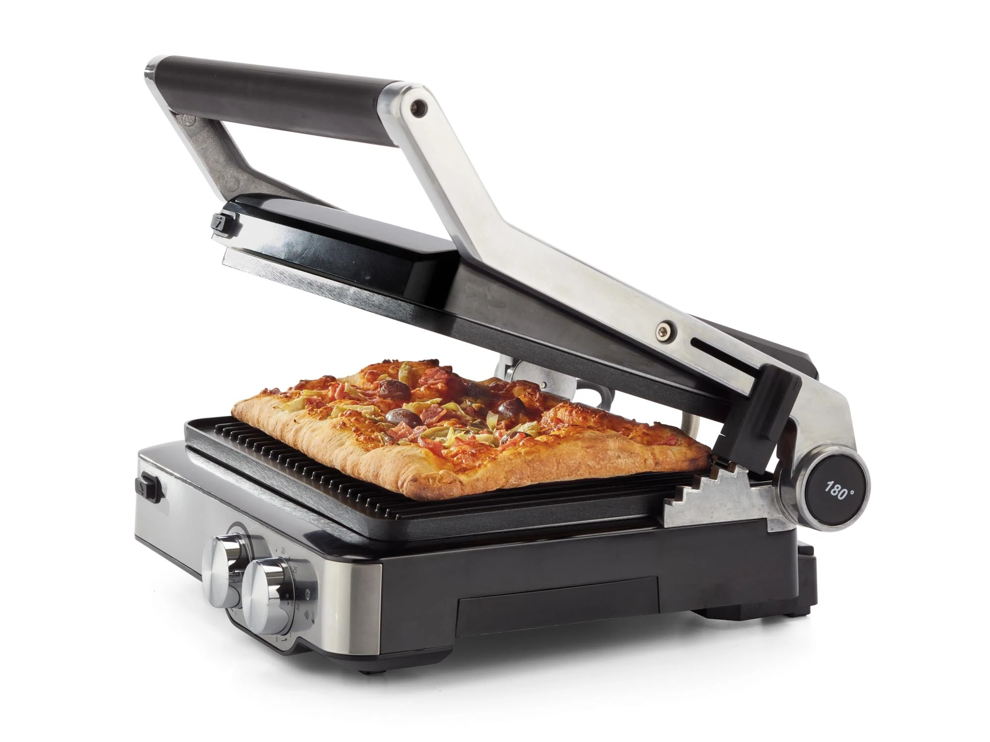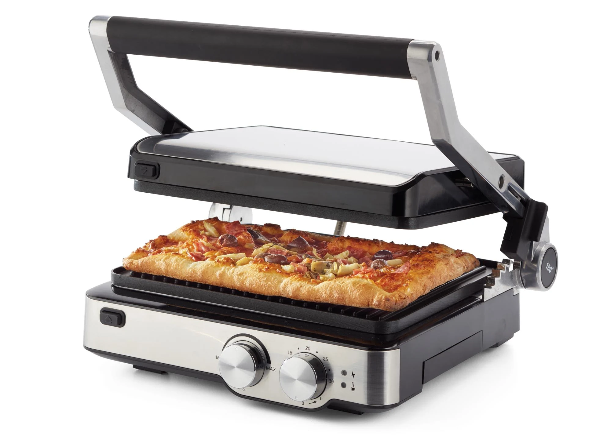 - إمكانية الطهي على سطح 180° بفتح الشواية بشكل كامل لتصبح شواية مزدوجة.