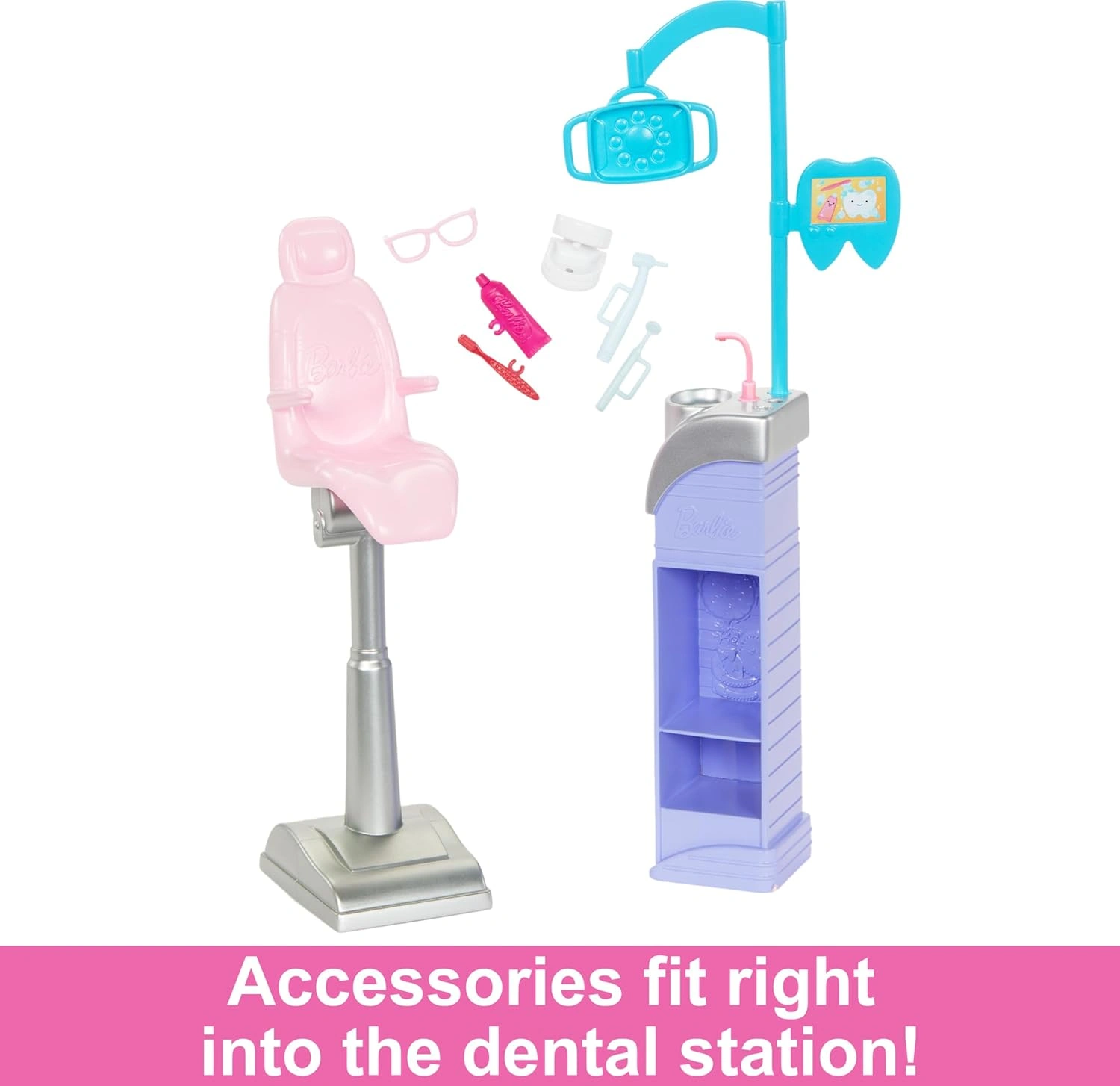 يمكن تخزين الأدوات على رفوف محطة الأسنان، كما يمكن للدميتين حمل الأدوات في أيديهم لتمثيل المواقف بشكل واقعي. ترتدي باربي معطفها الأبيض الأنيق وهي جاهزة للعناية بابتسامة الطفلة الصغيرة. لعبة مثالية لتنمية خيال الأطفال وتشجيعهم على لعب الأدوار كطبيب ومريض! مناسبة للأطفال من عمر 3 سنوات فما فوق.