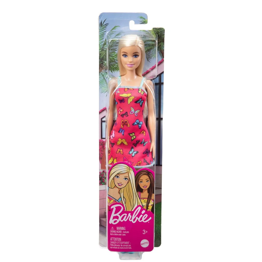 دمية باربي بفستان مطبوع بألوان فراشة وشعار باربي وحذاء بكعب – للأطفال من عمر 3 سنوات فما فوق