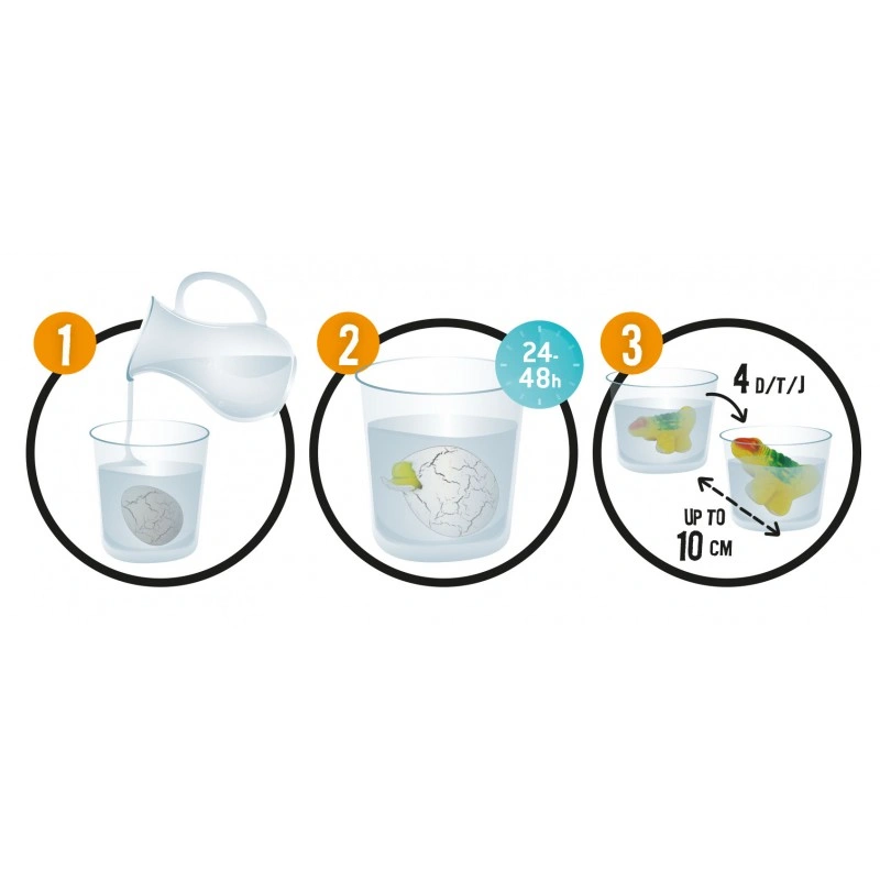 بيضة تغمس في الماء لتفقس وتنمو ديناصور. 6 نماذج للتجميع: ترايسيراتوبس، تيرانوسورس، براكيوسورس، سبينوسورس، ستيجوسورس وأنكيلوسورس