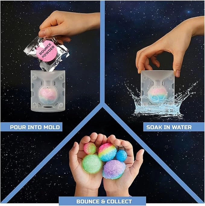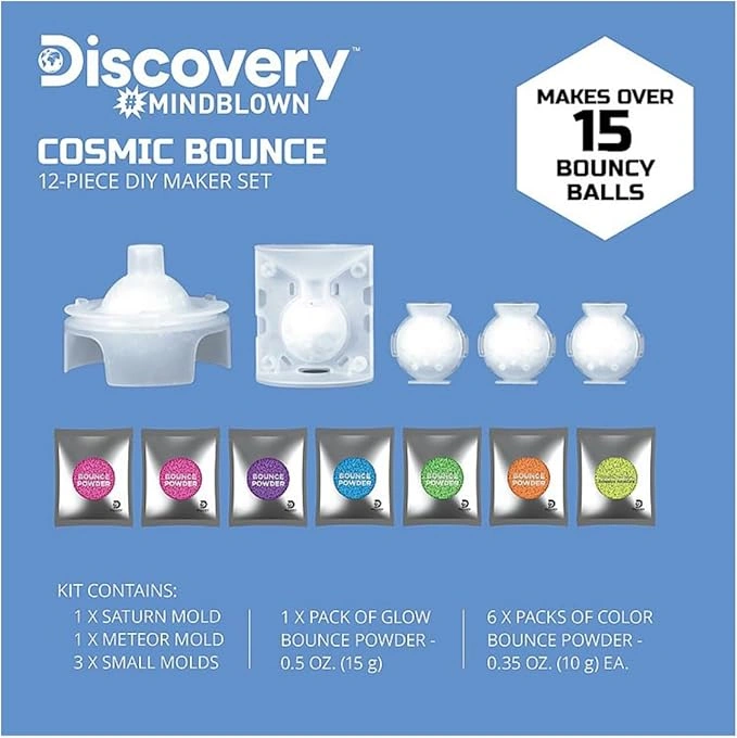 انطلق في مغامرة فضائية ممتعة مع مجموعة الكرات القافزة الكونية من ديسكفري #Mindblown! اصنع كرات قافزة مذهلة بتصاميمك الخاصة باستخدام قوالب ومساحيق ألوان زاهية، وأضف لمسة سحرية مع مسحوق التوهج في الظلام لتتحول كراتك إلى كواكب صغيرة متألقة!
