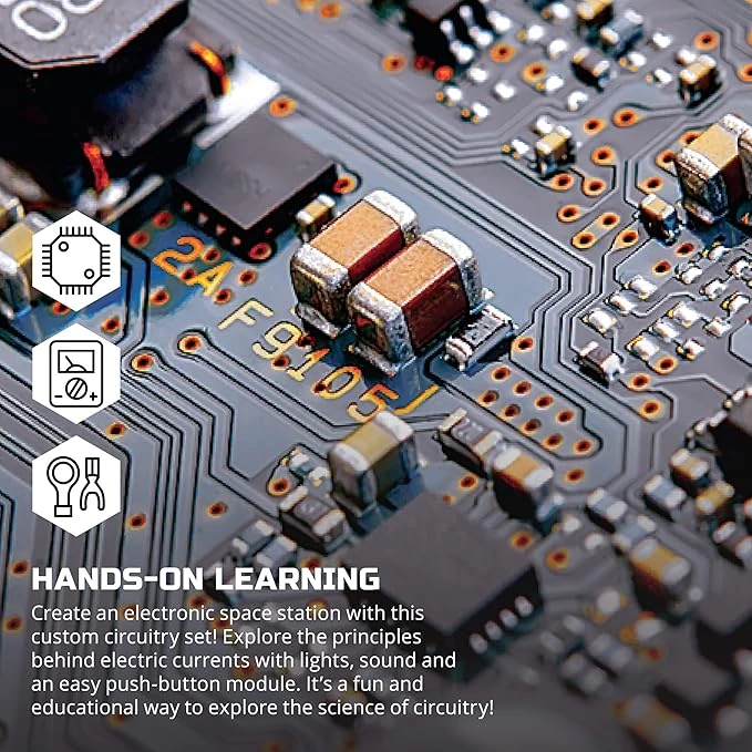 قم بتوصيل الدارات لتشغيل منارة الإنذار المضيئة قبل تحليل نيزك من الفضاء الخارجي! هذه المجموعة التفاعلية توفر تجربة تعليمية ممتعة ومليئة بالاكتشاف والإبداع.