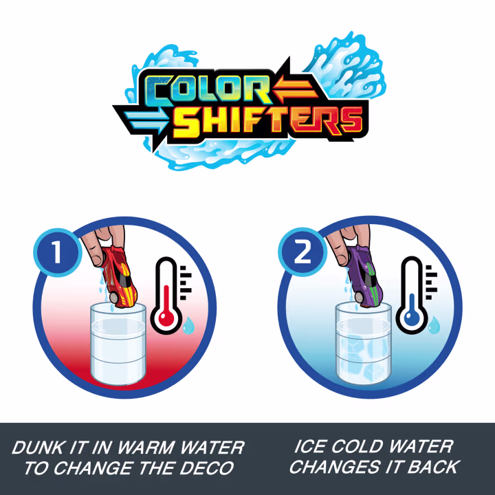استعد لتجربة مليئة بالمفاجآت مع سيارات Hot Wheels Color Shifters المتغيرة الألوان! غيّر لون سيارتك بالماء الدافئ، ثم أعدها إلى لونها الأصلي بالماء البارد – واستمتع بمشاهدة التحول المذهل أمام عينيك!
