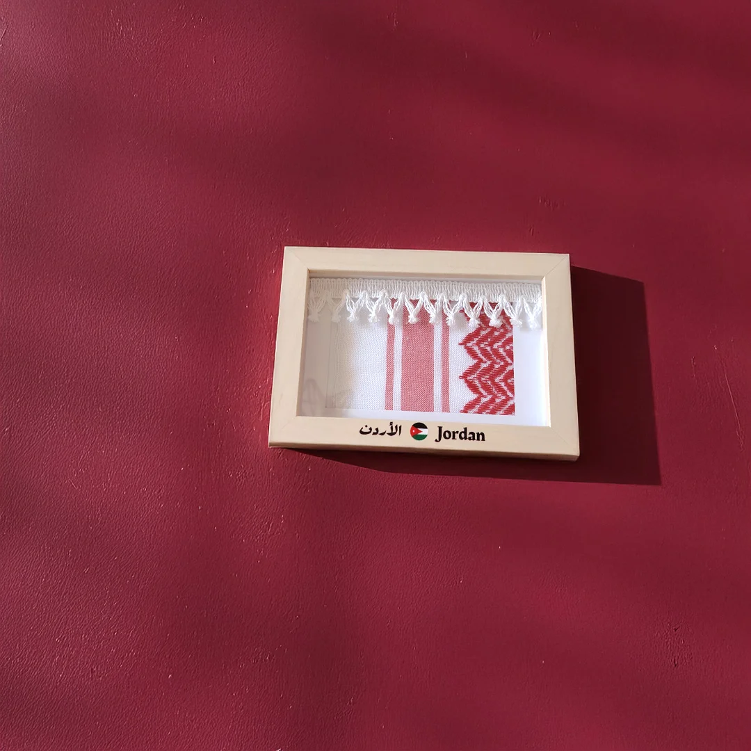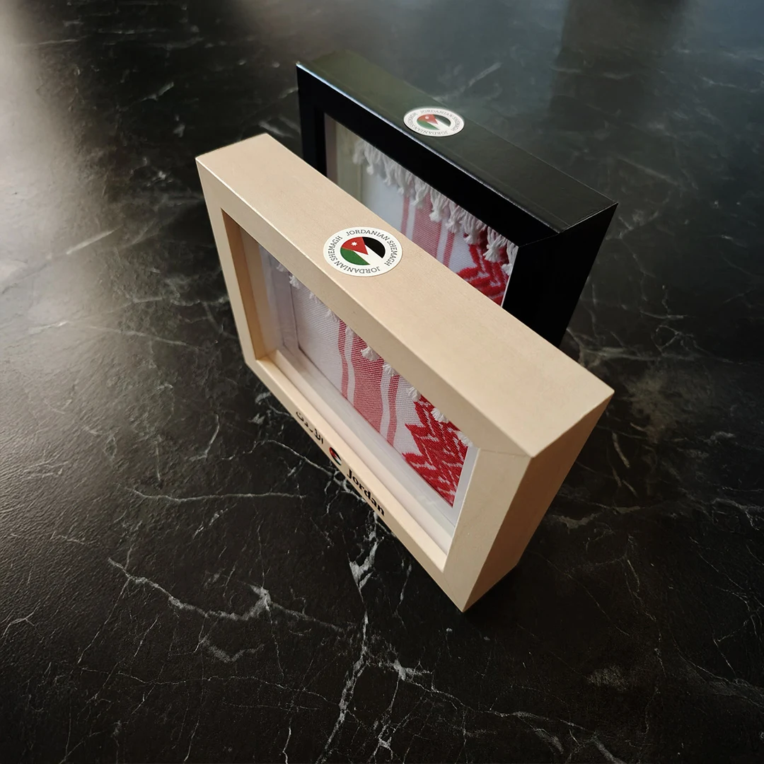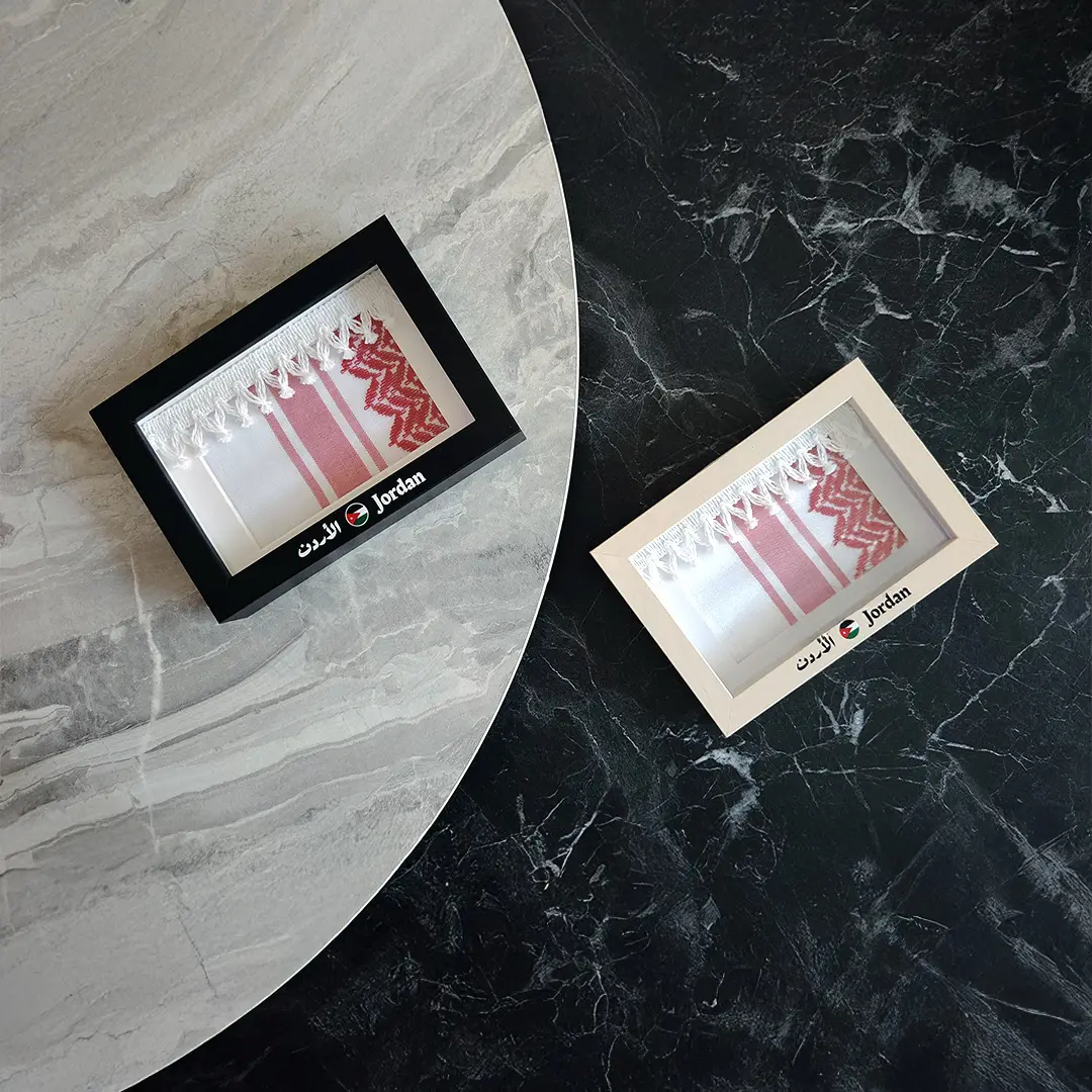 نسخة مصغّرة ومطابقة للنمط الأحمر والأبيض الشهير للشماغ الأردني، رمز للفخر الوطني وكرم الضيافة البدوية. مؤطر بأناقة، وهو قطعة ديكور ذات معنى أو هدية فريدة تضيف لمسة من التراث الأردني لأي مكان.