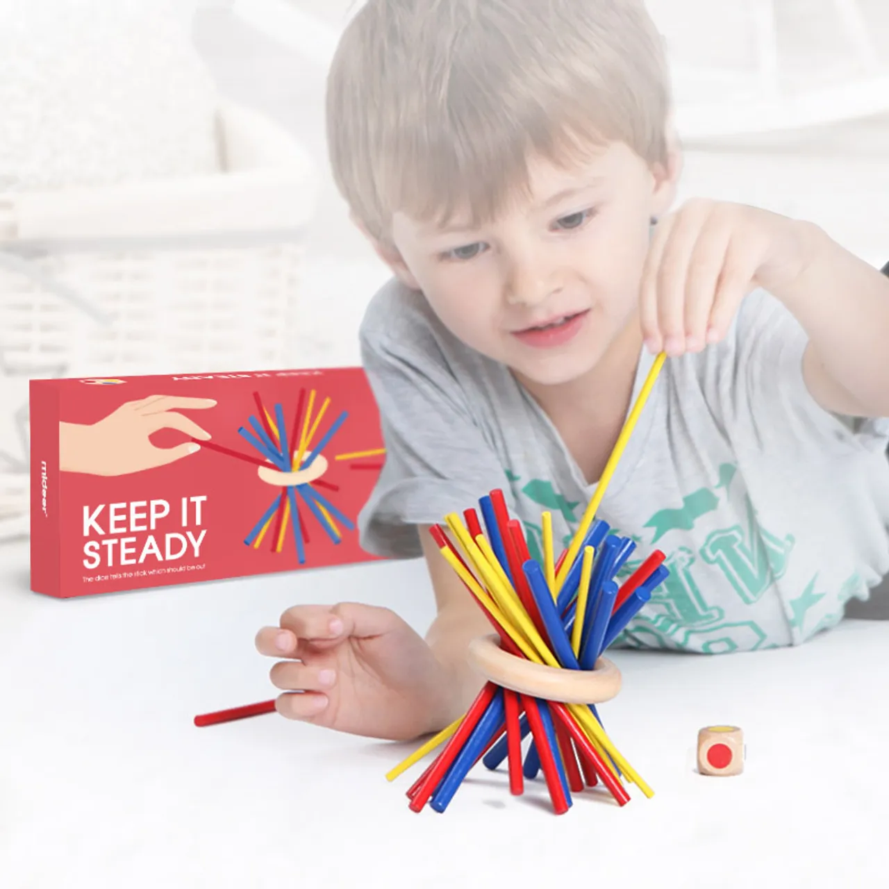 لعبة لوحة لتوازن العصي للأطفال. يظهر النرد أي عصا يجب سحبها من الحزمة. اللاعب الذي يمتلك يدًا ثابتة وبعض الحظ في رمي النرد يمكنه جمع نقاط قيمة. مدة اللعب 10 دقائق.