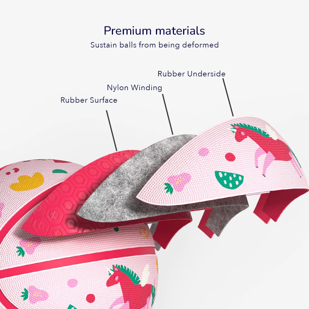 تتميز كرة السلة هذه بتصميم ساحر يضم موضوع الحصان يونيكورن، وهي مصنوعة من مواد عالية الجودة تحافظ على شكل الكرة ولا تجعلها تتشوه. تمتاز ببنية ثلاثية الطبقات تقاوم الضغط والتصويب، مما يجعلها مثالية للأطفال. اجتازت هذه الكرة اختبارات الجودة المتعددة لضمان سلامة الأطفال. كما أنها تتميز بطباعة عالية الجودة، وألوان زاهية ومضادة للتلاشي لضمان متعة دائمة.