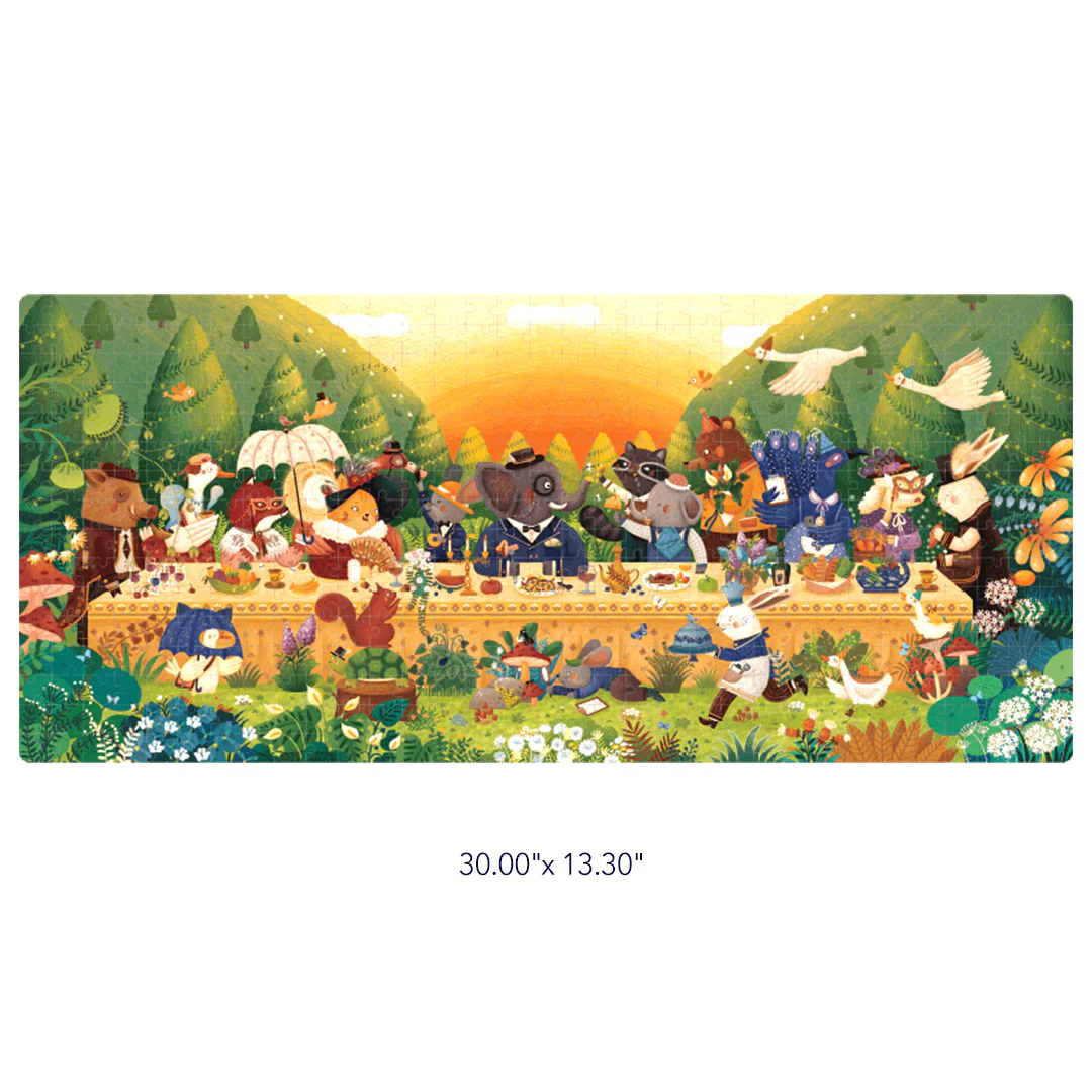 هذا اللغز يتميز بحيوانات الغابة حول طاولة طويلة في وقت الغروب، مستعدة لبدء الكرنفال. تخلق أنماط الرسم بالقلم منظرًا جميلاً للحفل.
