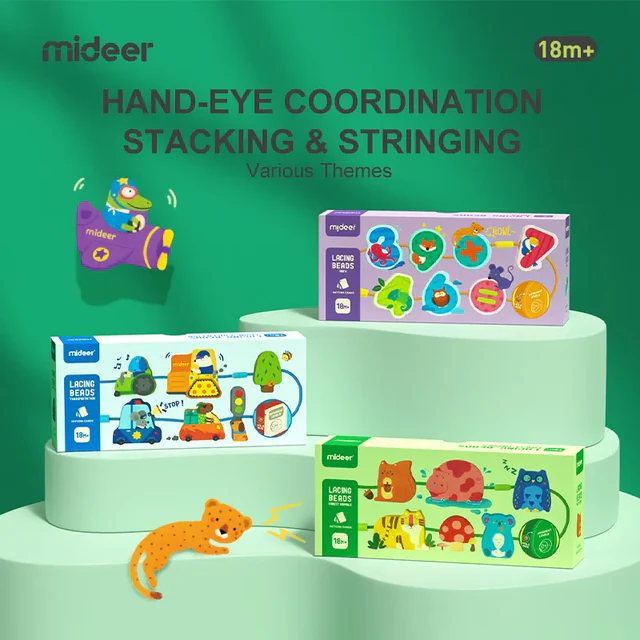 مجموعة خرز الربط من ميدير تساعد الأطفال على تطوير مهارات قوية في الحركة الدقيقة، والمعرفية، والإدراك البصري، وتعزز تنسيق اليد والعين. هذه الألعاب رائعة لتطوير الأطفال، وحجم خرزنا كبير بما يكفي للأطفال الصغار. يجب استخدامها تحت إشراف شخص بالغ.