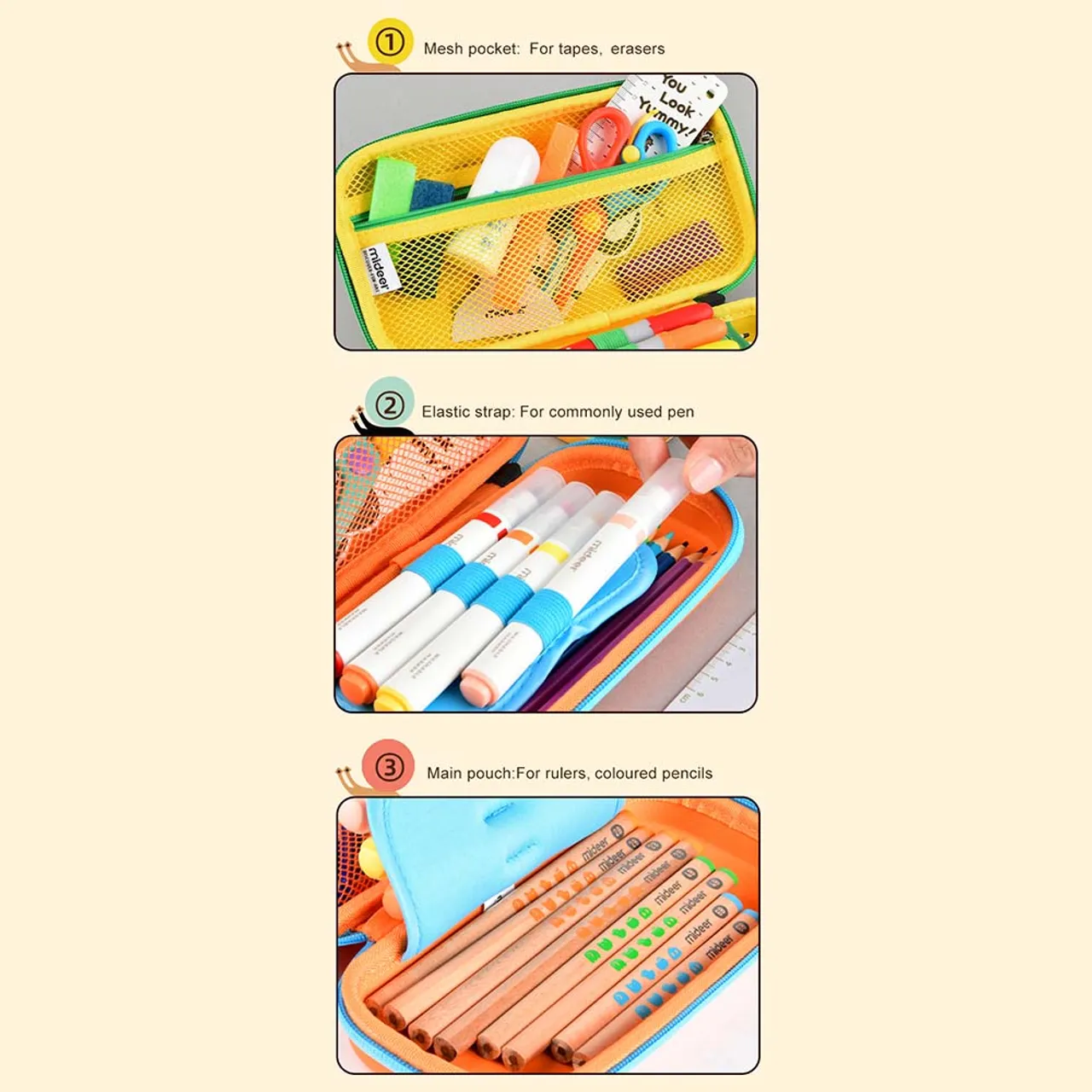هذه الحقيبة مصنوعة من مواد EVA عالية الكثافة مقاومة للماء مما يجعلها سهلة التنظيف. تصميم الجيب المزدوج يجعل التنظيم أسهل. الجانب الأيسر رائع للأشياء الأكبر مثل الممحاة أو المسطرة، بينما الجانب الأيمن للأقلام وأقلام الرصاص. الفتحة الواسعة تجعل من السهل على الأطفال الوصول إلى أدواتهم المكتبية.