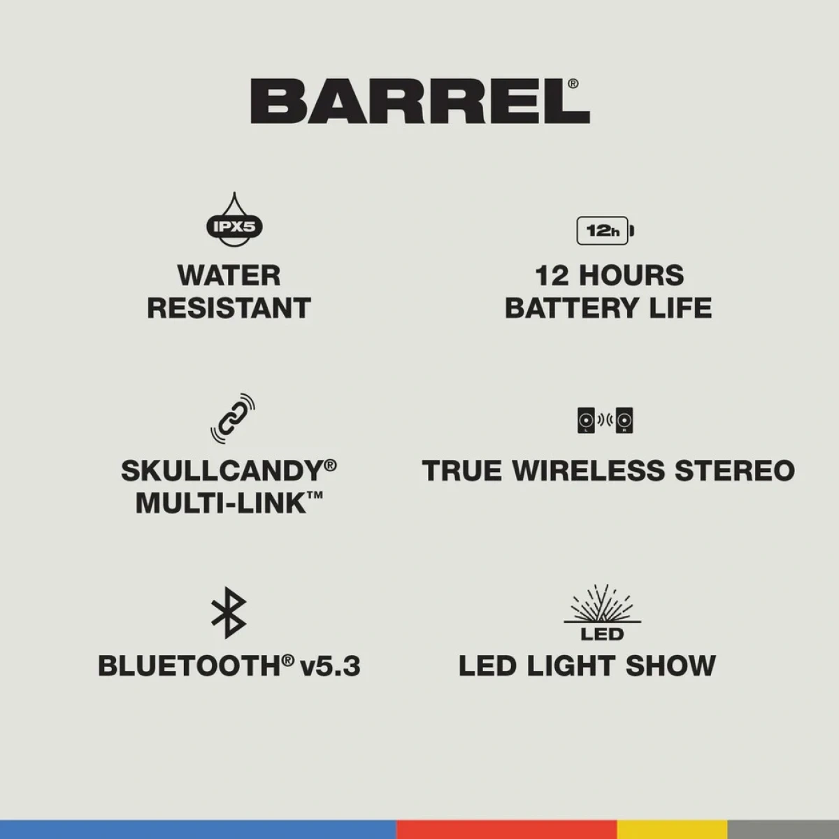 يعد سكل كاندي باريل™ برايمر مكبر صوت بوم بوكس لاسلكي قوي، مثالي للحفلات وسهل الحمل. يوفر صوتًا ضخمًا من خلال درايفرات مزدوجة، مع تقنية Bluetooth® 5.3، وتصميم مقاوم للماء، وميزة Skullcandy Multi-Link، بالإضافة إلى عرض إضاءة LED نابض بالحياة. يأتي مع حزام حمل قابل للفصل لسهولة التنقل، مما يجعله الخيار المثالي للاستخدام داخل وخارج المنزل.