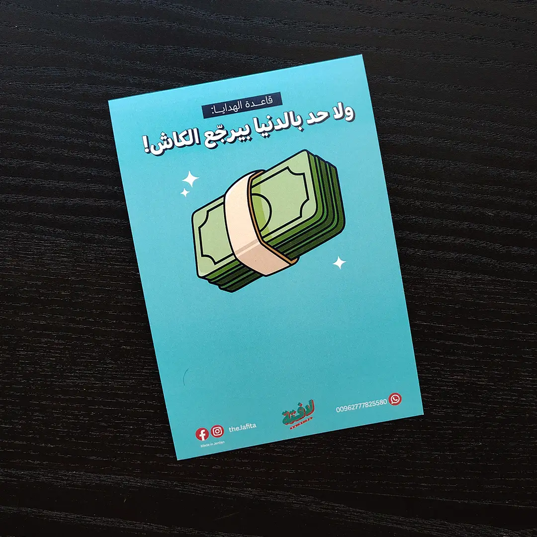 أضف لمسة من المرح والشخصية على هديتك مع بطاقاتنا الطريفة التي تحمل عبارات عامية مشهورة ورسومات مرحة. مثالية للأصدقاء والعائلة الذين يحبون الفكاهة والضحك. طريقة فريدة ولا تُنسى لتقديم المال، تضمن رسم الابتسامة وإضفاء جو من البهجة، لتجعل هديتك استثنائية فعلًا.