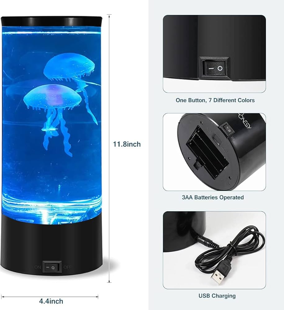 أضف لمسة فريدة لأي غرفة مع حوض Jellyfish الدائري. يخلق جوًا رائعًا بتوهج أضواء LED، مثالي للأرفف أو الأدراج أو الرفوف، وسيكون حديث الجميع في التجمعات. الحوض البلاستيكي قابل للملء من خلال فتحة صغيرة في الأعلى مع سدادة محكمة. يحتوي على سمكتين من السيليكون (5 سم طول الجسم) تسبحان بحركة واقعية بفضل تيارات الهواء.