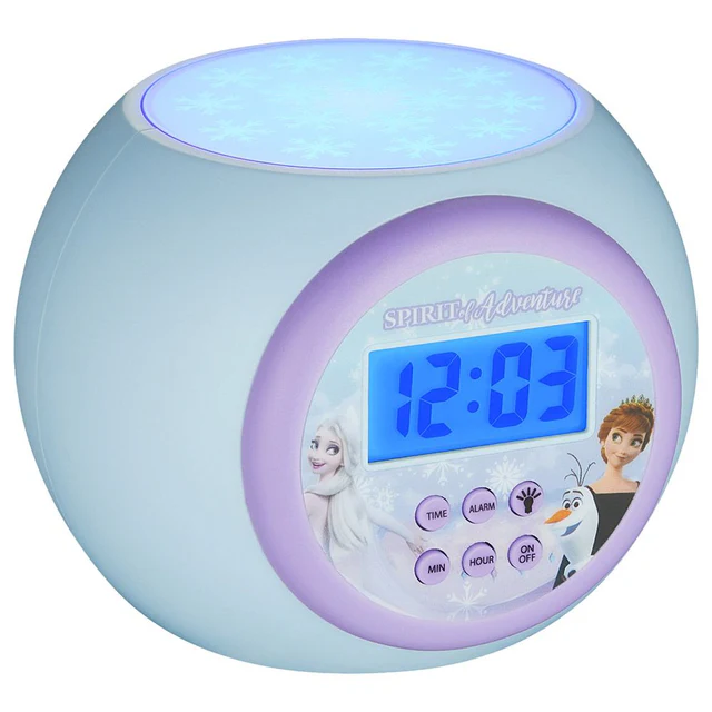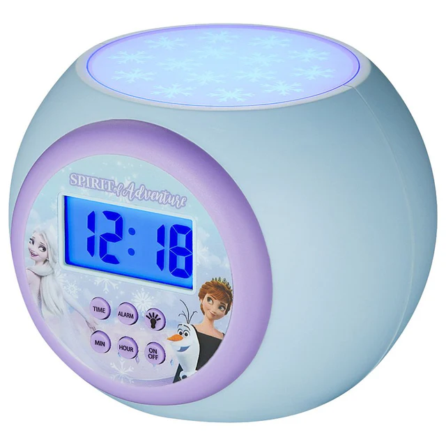 SMD Disney Frozen Projector Alarm Clock for kids offers a magical wake-up experience with its gentle melodies and a blue backlight LCD screen. The clock projects snowflakes on the ceiling in three colors, creating an enchanting atmosphere. It includes an automatic timer with 5, 10, or 30-minute settings to turn off. The compact size fits perfectly on your nightstand, while the LED display ensures readability in the dark. With simple buttons to adjust the time, alarm, and projection settings, you can easily personalize your Frozen experience.