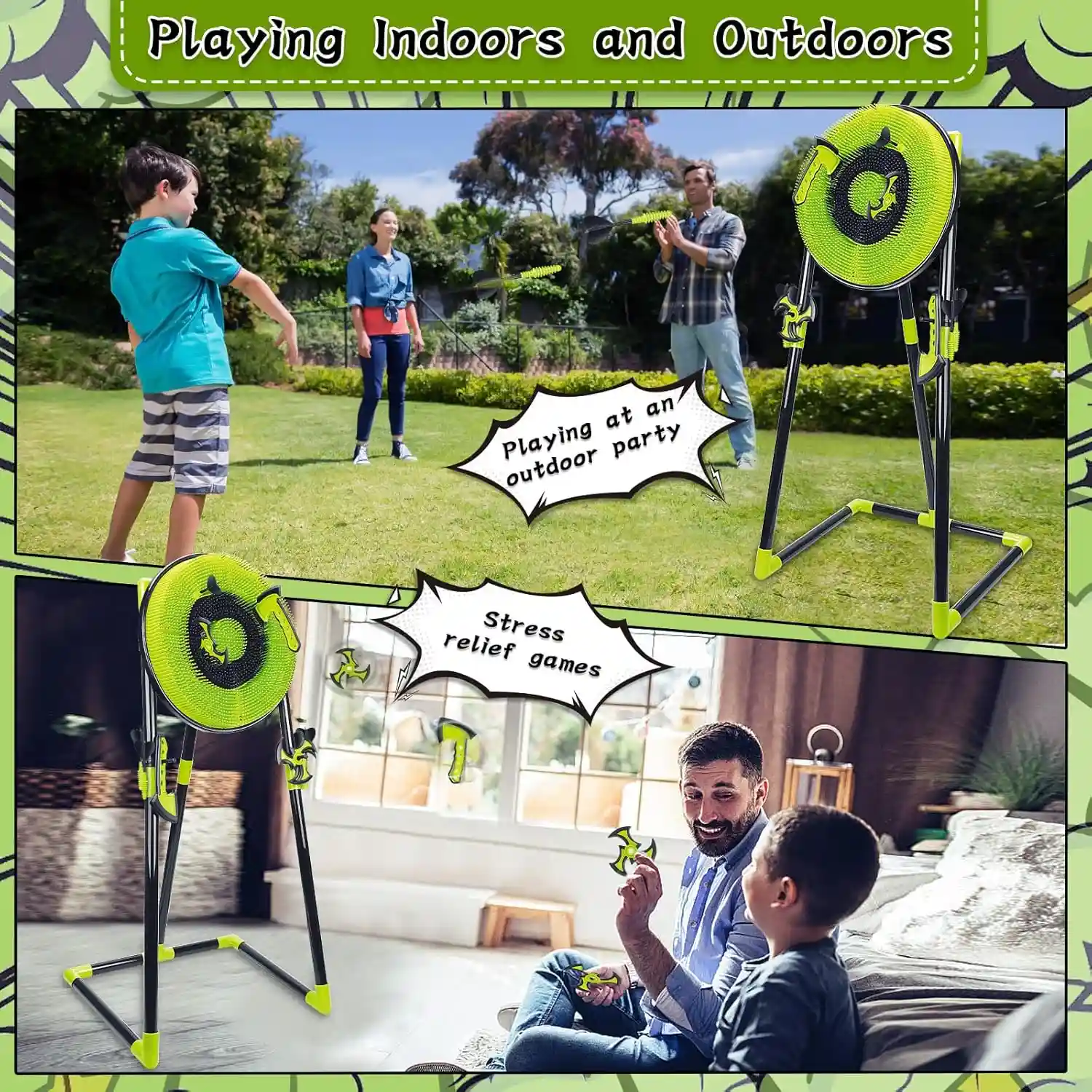 The Aojie Sport plastic axe throwing set offers a fun and safe experience with four types of throwing games: a durable bristle target, 3 throwing axes, 3 ninja darts, 6 regular darts, and a bow with 6 arrows. All pieces are made from high-quality, lightweight materials to reduce the risk of injury, making it perfect for both kids and adults to enjoy indoors or outdoors.