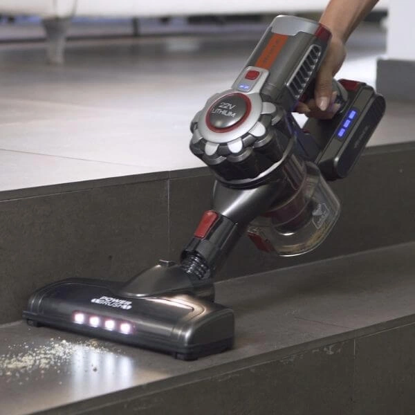 - Cordless electric broom with 22.2V 2200 mAH lithium-ion rechargeable battery.