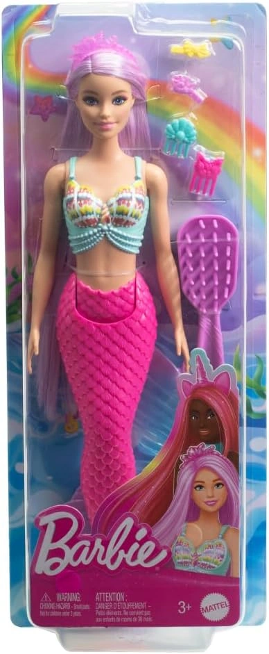 This fantastical mermaid Barbie doll rocks extra-long and colorful pink hair! Kids can style her hair with the included accessories, then brush out and repeat for endless play. Enchanting elements like an ocean-inspired headband and bodice lend this Barbie mermaid doll an extra dash of magic. She will inspire hours of dress-up play and imaginative fun for kids ages 3 years old and up! Doll cannot swim or stand alone. Colors and decorations may vary.