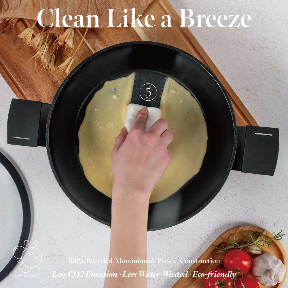 - Forged aluminum thick wall body and a 3-layer non-stick TitanPro coating.