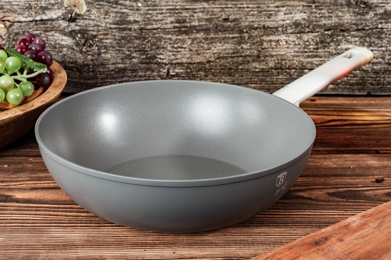- Forged aluminum thick wall body with Titanium non-stick coating.
