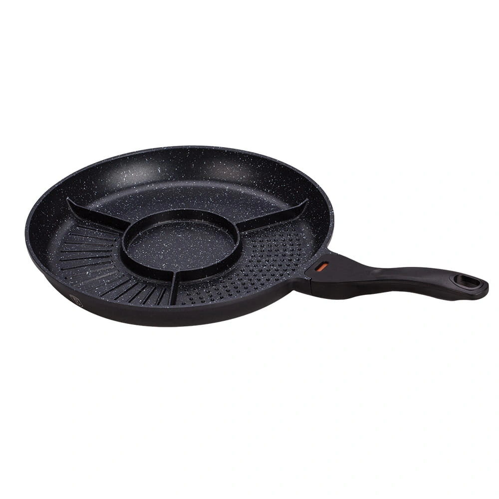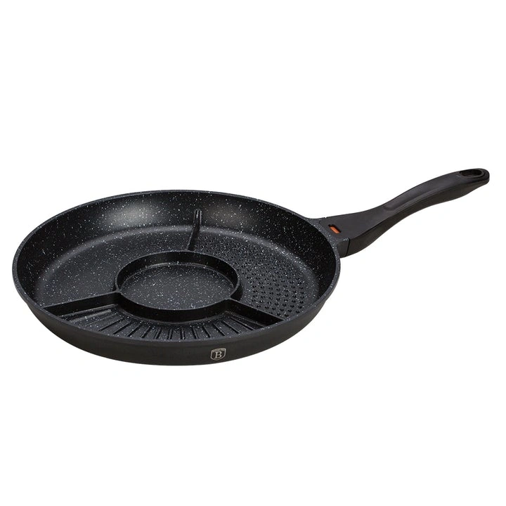 - Cast aluminum thick wall body and a 3-layer non-stick marble coating.
