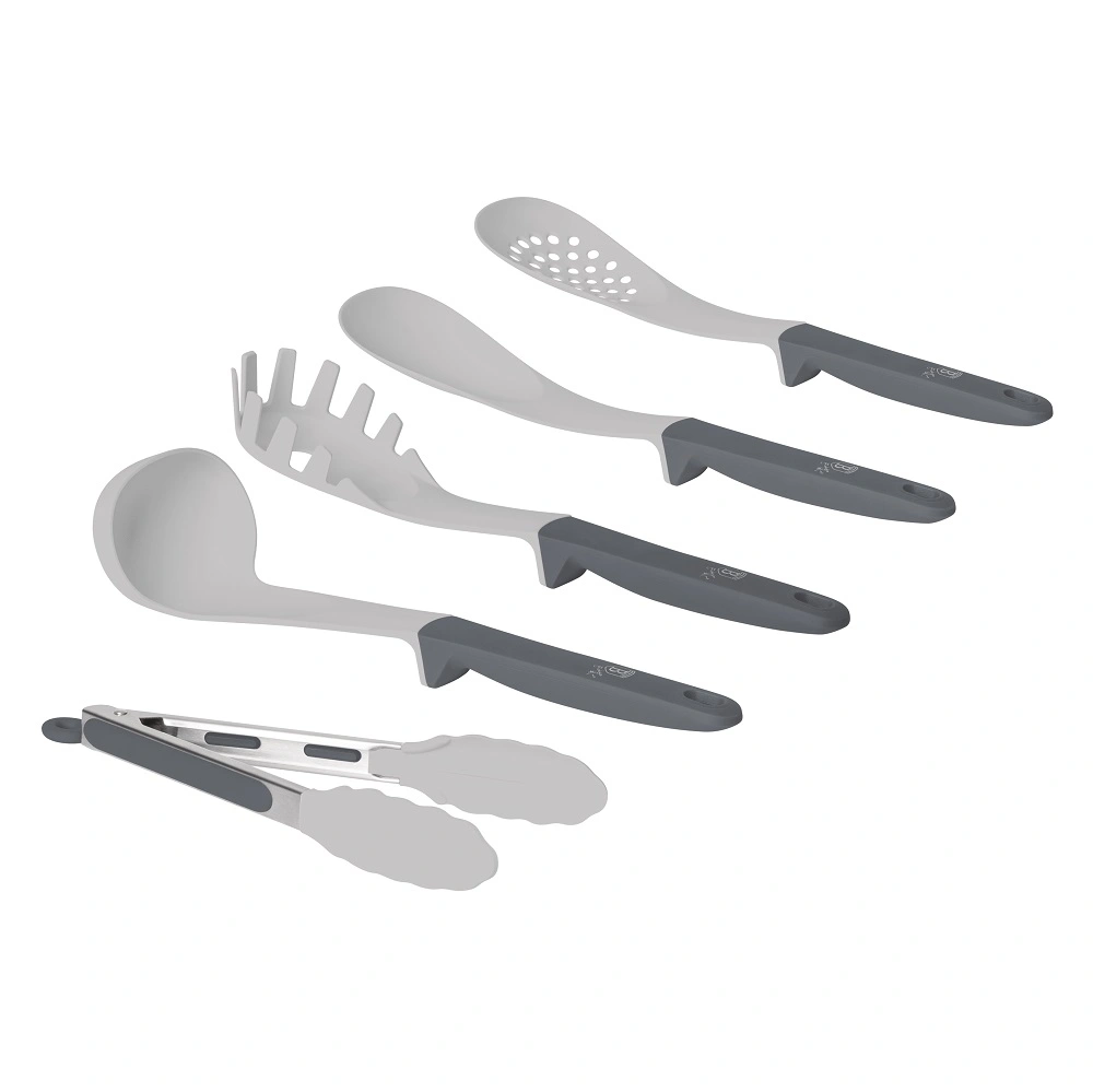 Set Includes: 1 Cooking spoon, 1 Spaghetti ladle, 1 Skimmer, 1 Soup ladle, 1 Food clamp.