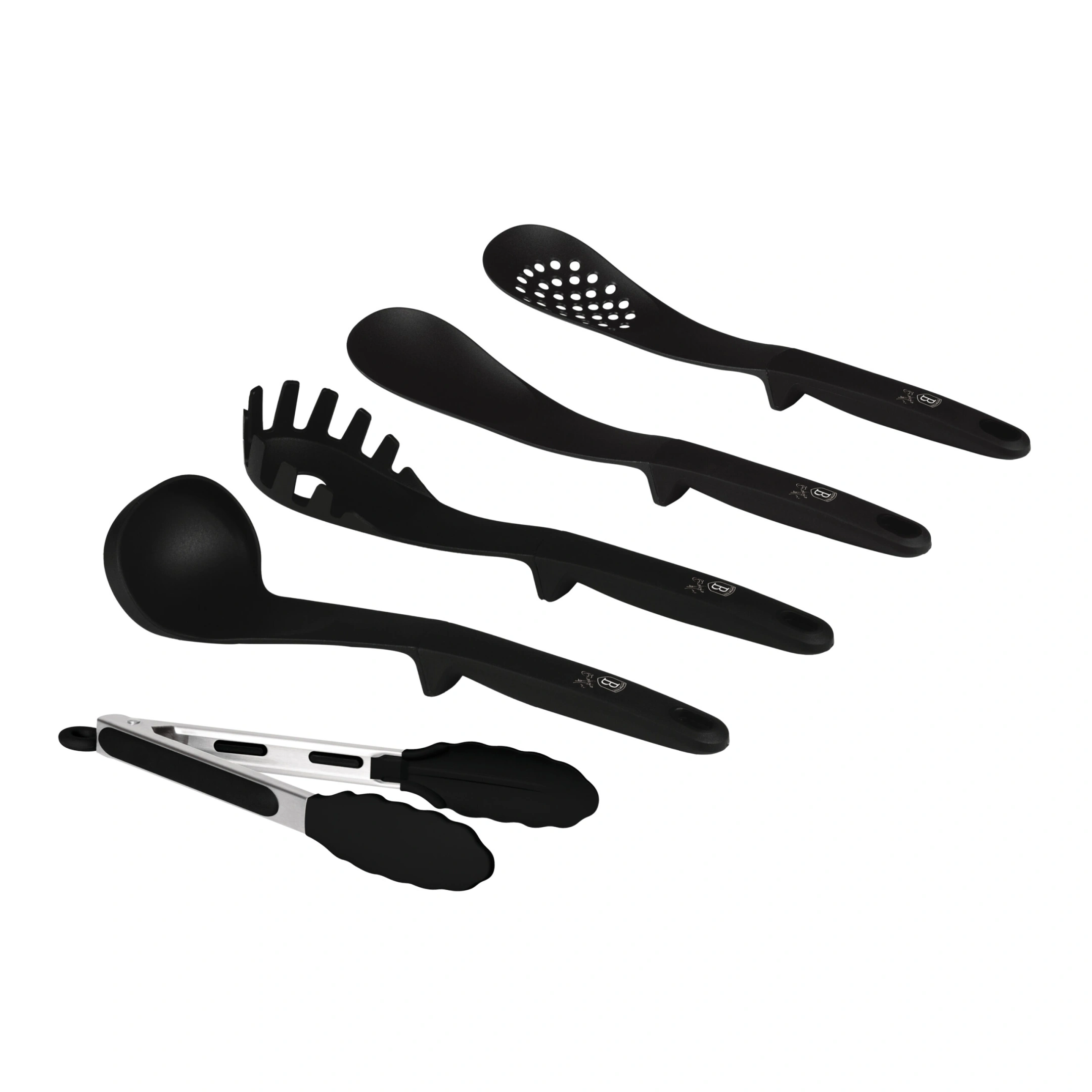 Set Includes: 1 Cooking spoon, 1 Spaghetti ladle, 1 Skimmer, 1 Soup ladle, 1 Food clamp.
