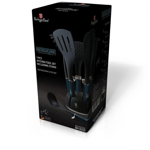 Set Includes: Soup ladle, Cooking spoon, Masher, Spaghetti ladle, Slotted turner, Skimmer, Stand.