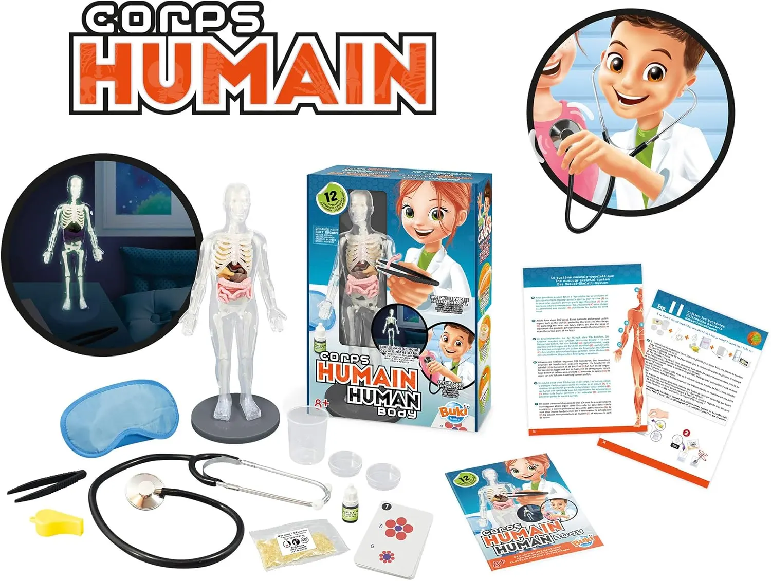 Buki France 2163 Human Body Learning Toy is a scientific kit to learn more the human anatomy. Discover 12 experiments to understand the secrets of the human body cultivate bacteria, make slimy mucus and listen to your heart beating with the stethoscope. The human body has soft organs and it glows in the dark. It has included model of a human body, stethoscope, whistle, coloring, beaker and gelatine… Suitable for 8 years and above.