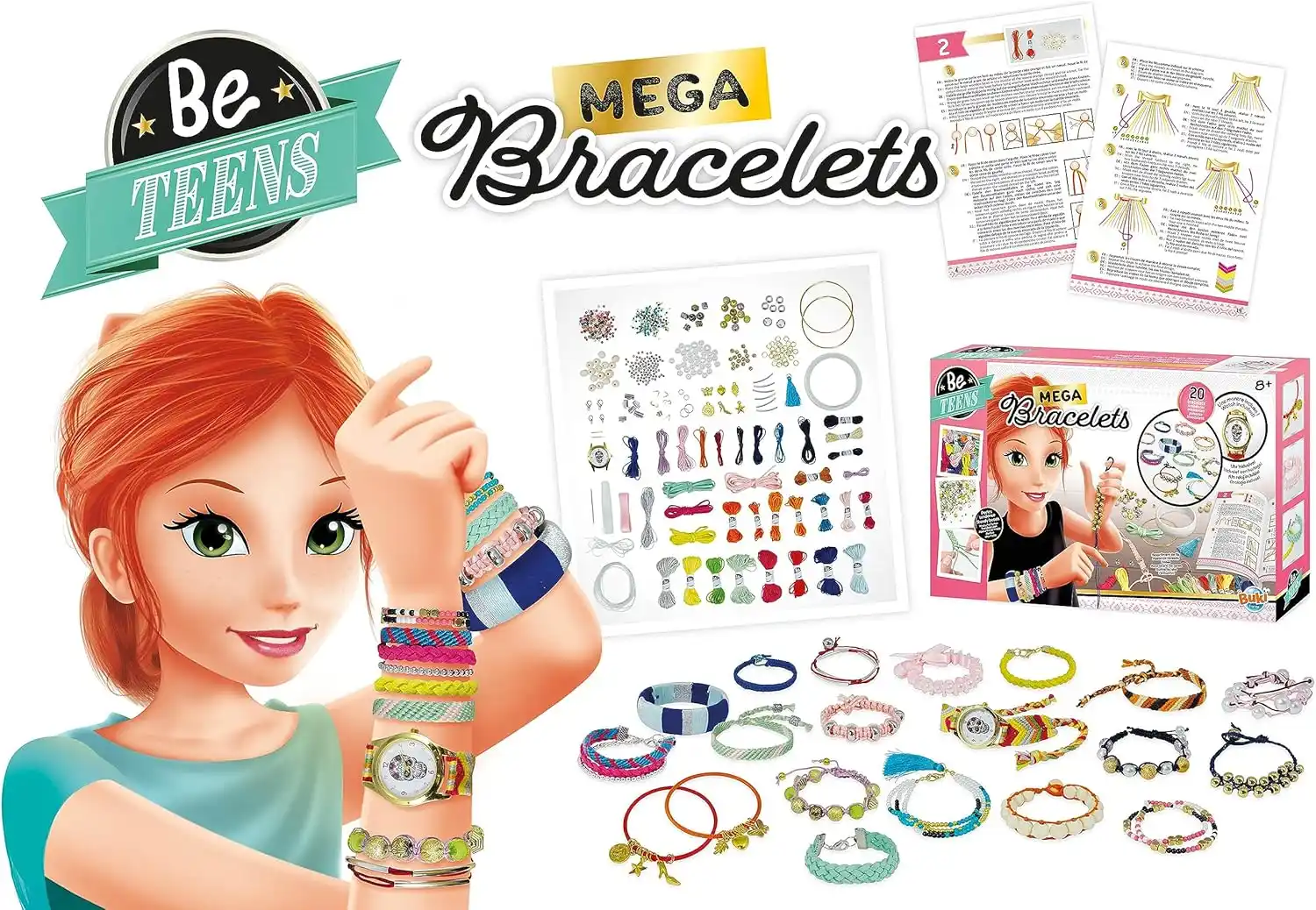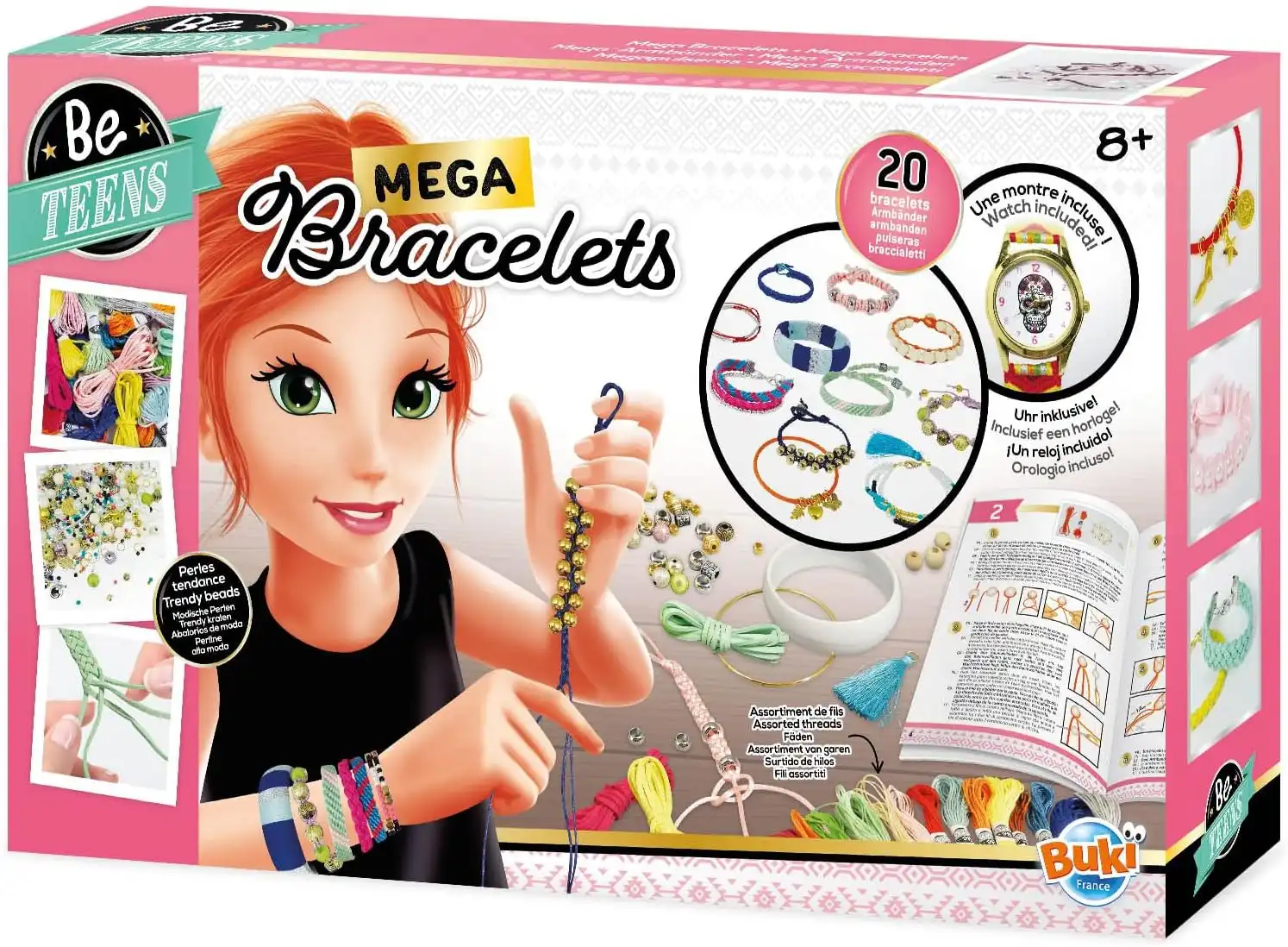 Buki France BE003 Be Teens Mega Bracelets is made from high quality material which is safe to use. a kit to make 20 trendy bracelets including shamballa bracelets, ribbon bracelets, friendship bracelets, charm bracelets, and more. A watch face is included so you can weave the straps. This set comes with watch face, cotton threads in 20 colours, waxed threads in 8 colours, cords in 2 colours, straps in 3 colours, plastic bracelet, metal bracelets, pink ribbon (80 cm), pompom, charms, assorted beads, assorted clasps, 38 rings, transparent elastic thread (70 cm), white thread (5 m), needle, tube of glue. Provides hours of fun for your kids. It is recommended for age 8 years and above. Comes in multicolour pack.