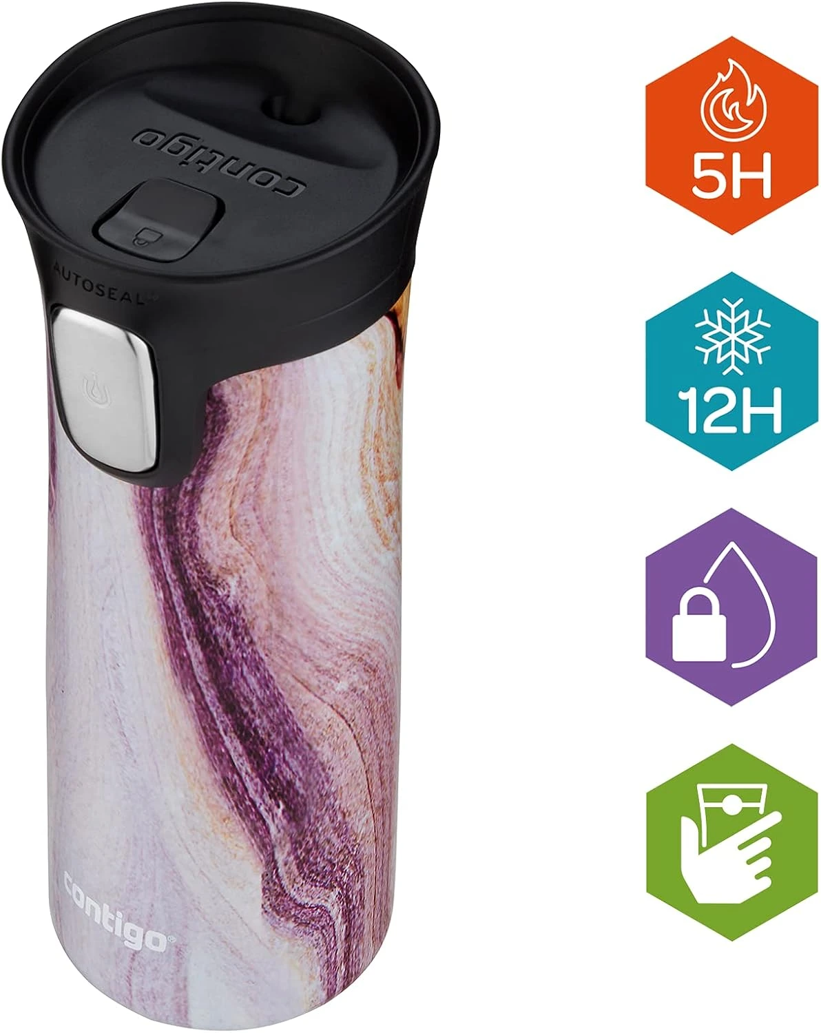 The Contigo Autoseal Pinnacle Couture Travel Mug (420 ml) is made from double-wall vacuum-insulated stainless steel, keeping drinks hot for up to 5 hours or cold for up to 12 hours. It features AUTOSEAL™ technology for complete spill- and leak-proof performance between sips, with a premium design in sandstone for a stylish touch. The lid opens fully for easy cleaning, and both the lid and body are top-rack dishwasher safe.