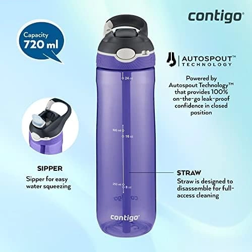The Contigo Autospout Ashland Water Bottle (720 ml) is crafted from double-wall vacuum-insulated stainless steel, keeping drinks hot or cold for extended periods. It features Autospout™ technology for easy, spill-free sipping, with a modern Grapevine design ideal for everyday use and travel. The lid opens fully for easy cleaning, and the bottle is top-rack dishwasher safe.