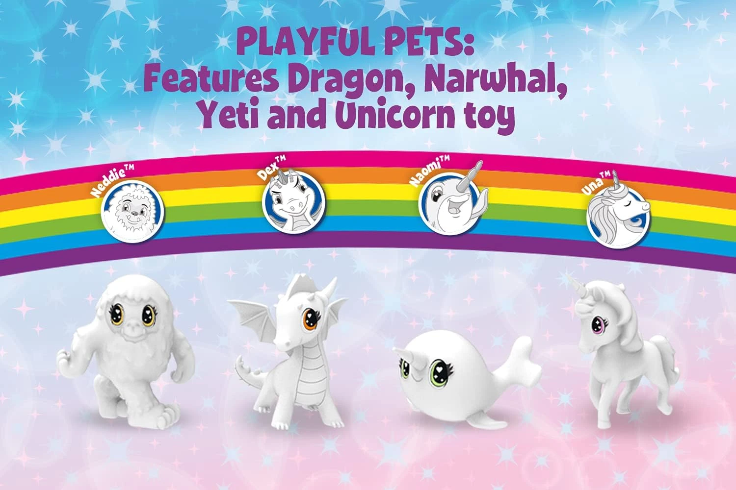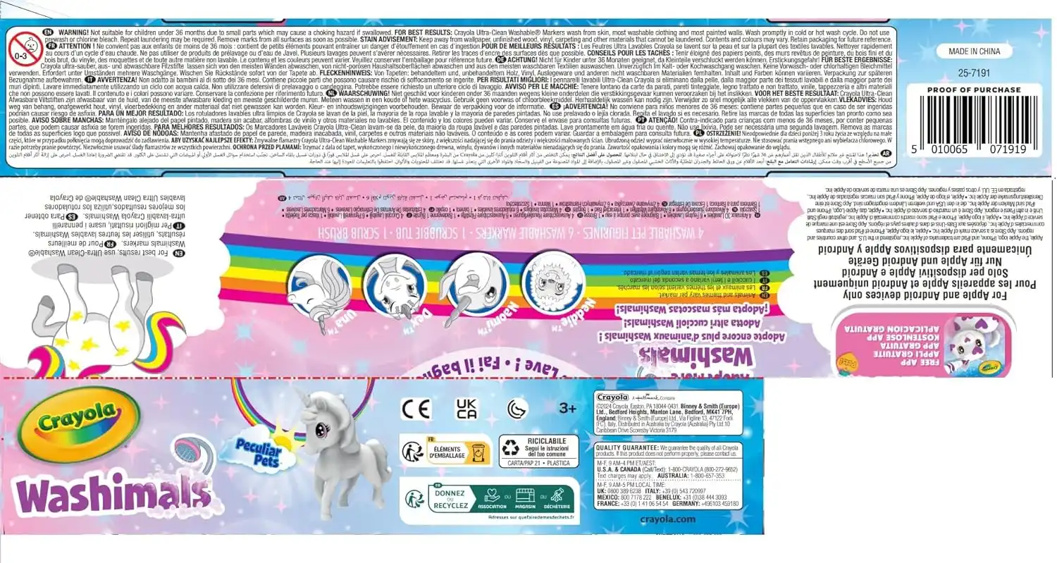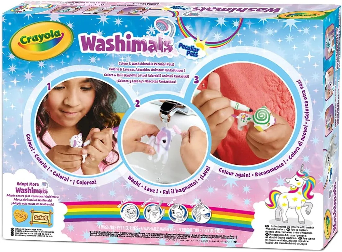 Start a creative adventure with the Crayola Washimals Peculiar Pets Lava & Recolour Set! This kit includes 4 adorable plush pets (Unicorn, Yeti, Narwhal, and Dragon), 6 washable markers, a tub, and a brush. Kids can color, wash, and recolor their pets for endless fun. Perfect for imaginative play and learning to care for pets. Recommended for ages 3+.