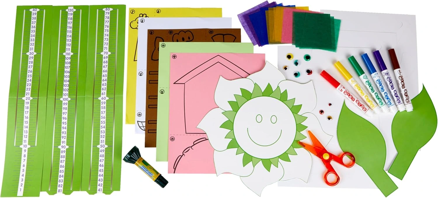 2 masks, 1 play cube, 7 small paper animals, 1 wall-hanging tape measure