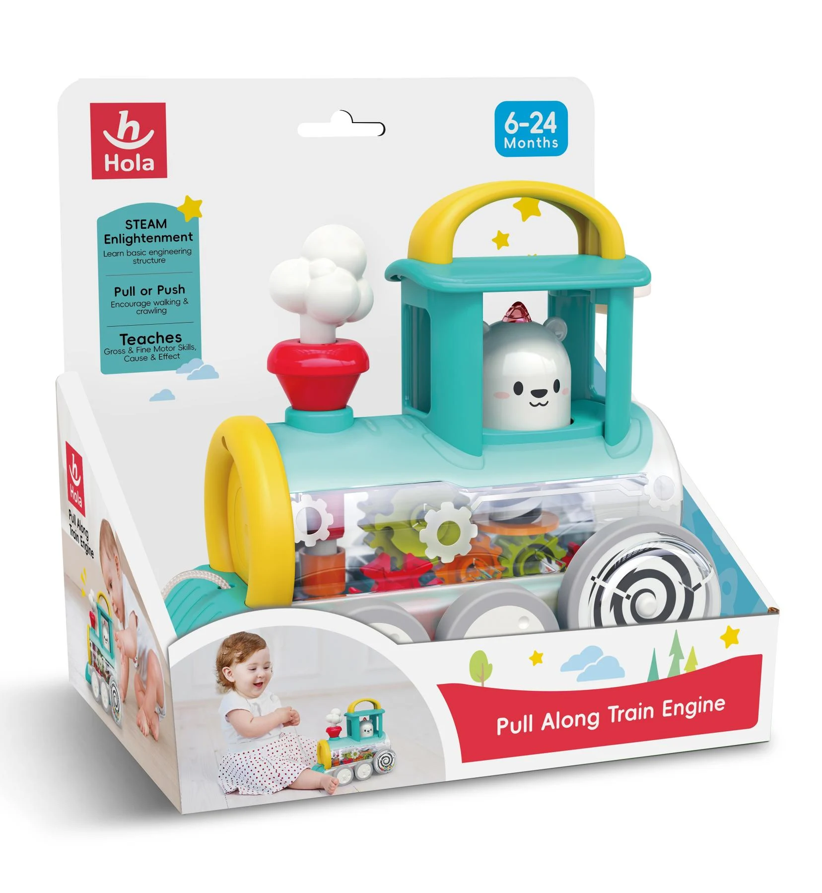 The HOLA Pull Along Train Engine – Yellow is a fun, interactive toy that encourages children to pull, push, and move while exploring colors and sounds. It promotes gross motor skills, hand-eye coordination, and imaginative play, making it perfect for active play and early learning fun.