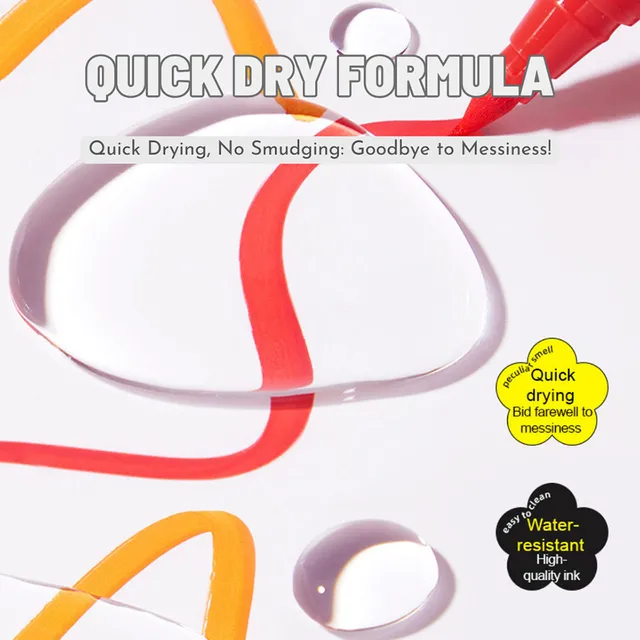 Acrylic Markers - Round Nib are perfect for beginners, offering consistent 1-3mm line width for easy control and precise detailing. The hard nib maintains its shape, ensuring even ink application without bending. These markers are versatile for paper, rock painting, and other projects. They dry quickly, are easily erasable, and come in a practical pull-out package. Safe, non-toxic, and ideal for budding artists.