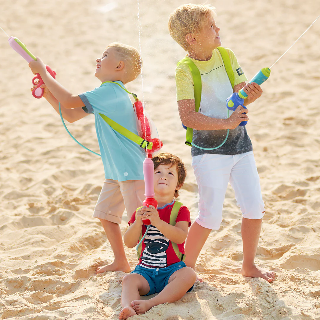 The Mideer Water Gun Backpack features an adjustable strap and two shooting modes: direct fire up to 5-8 meters and wide-area scatter. Easy pull-out design helps develop hand coordination. Leakproof ring and silicone tube for smooth water flow. Durable ABS material and ergonomic pistol shape with a convenient water-filling knob. Cute crab design.