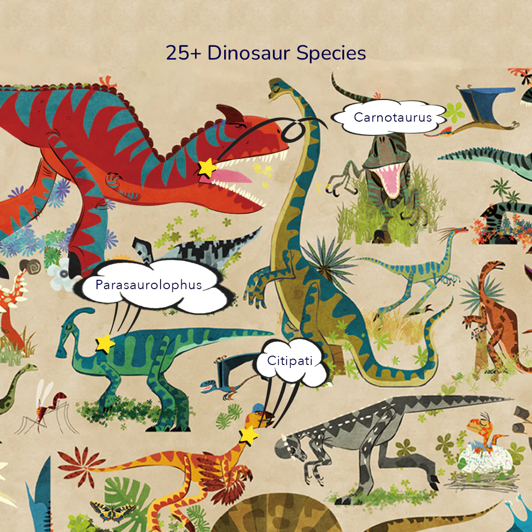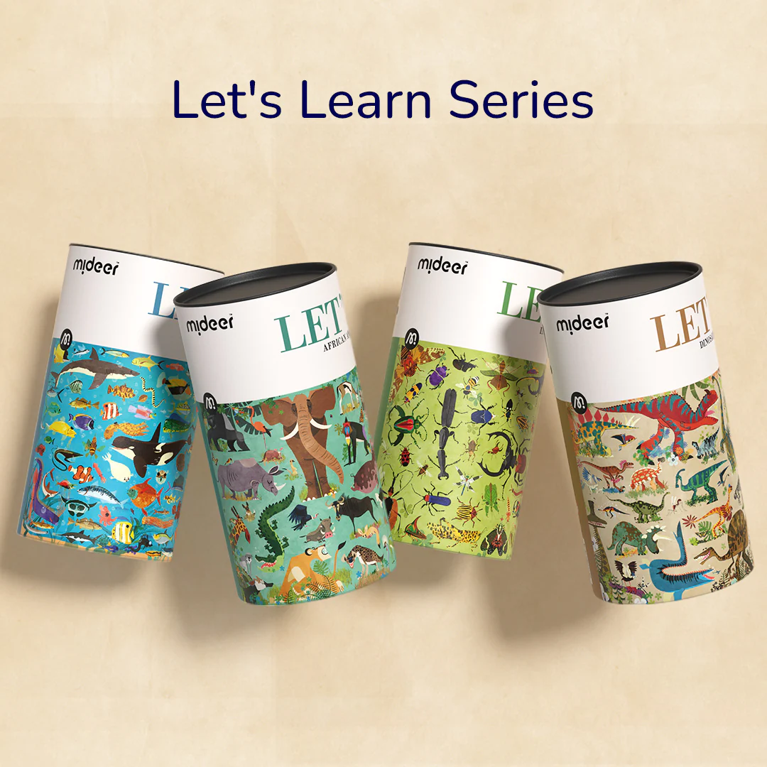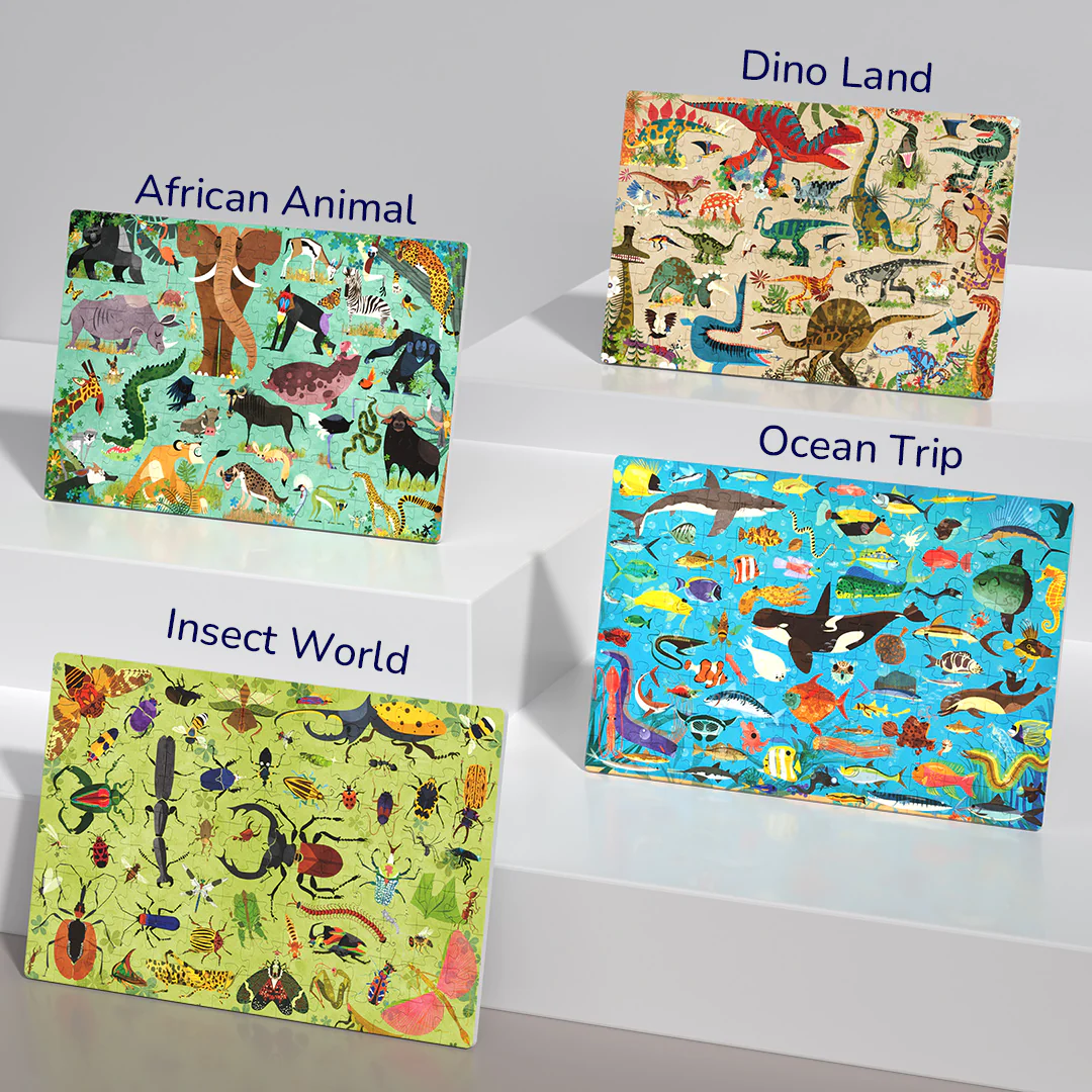 Let’s Learn! puzzle series leads children to learn hundreds of species during playing. Barrel packaging design that is free of mess and easy to store. Each puzzle has a double-sided science brochure. Relive you the Jurassic World together! This puzzle features over 25 dinosaur characteristics and living environment. Get to know them all!