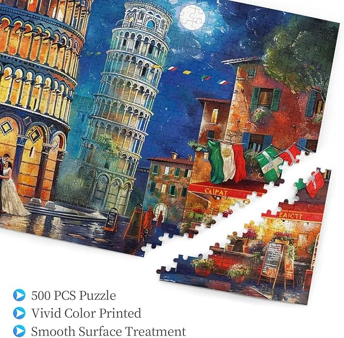Take a journey to Italy with this 500-piece Ravensburger puzzle featuring the streets of Pisa. Crafted with extra-thick, precision-cut pieces and linen-textured, glare-free paper, each piece fits perfectly for a smooth, frustration-free assembly. Great for enhancing focus, memory, and problem-solving skills, it provides a relaxing and enjoyable activity for all ages, backed by Ravensburger’s lifetime quality guarantee.